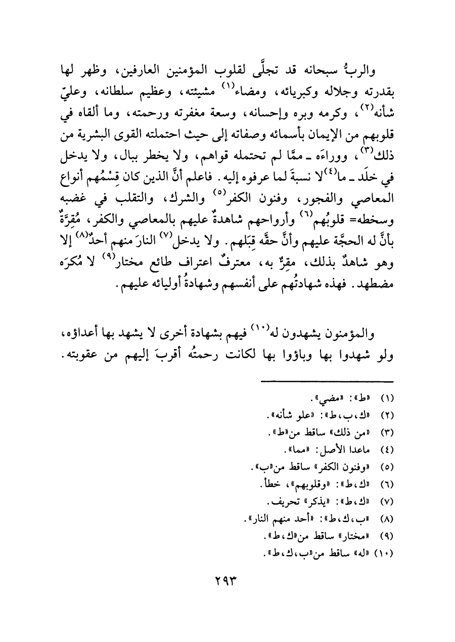 والربُّ سبحانه قد تجلَّى لقلوب المؤمنين العارفين، وظهر لها بقدرته وجلاله وكبريائه، ومضاء (¬١) مشيئته، وعظيم سلطانه، وعليّ شأنه (¬٢)، وكرمه وبره وإحسانه، وسعة مغفرته ورحمته، وما ألقاه في قلوبهم من الإيمان بأسمائه وصفاته إلى حيث احتملته القوى البشرية من ذلك (¬٣)، ووراءَه -ممَّا لم تحتمله قواهم، ولا يخطر ببال، ولا يدخل في خلَد- ما (¬٤) لا نسبةَ لما عرفوه إليه. فاعلم أنَّ الذين كان قِسْمُهم أنواع المعاصي والفجور، وفنون الكفر (¬٥) والشرك، والتقلب في غضبه وسخطه = قلوبُهم (¬٦) وأرواحهم شاهدةٌ عليهم بالمعاصي والكفر، مُقِرَّةٌ بأنَّ له الحجَّة عليهم وأنَّ حقَّه قِبَلهم. ولا يدخل (¬٧) النارَ منهم أحدٌ (¬٨) إلا وهو شاهدٌ بذلك، مقِرٌّ به، معترفٌ اعتراف طائع مختار (¬٩) لا مُكرَه مضطهد. فهذه شهادتُهم على أنفسهم وشهادةُ أوليائه عليهم.