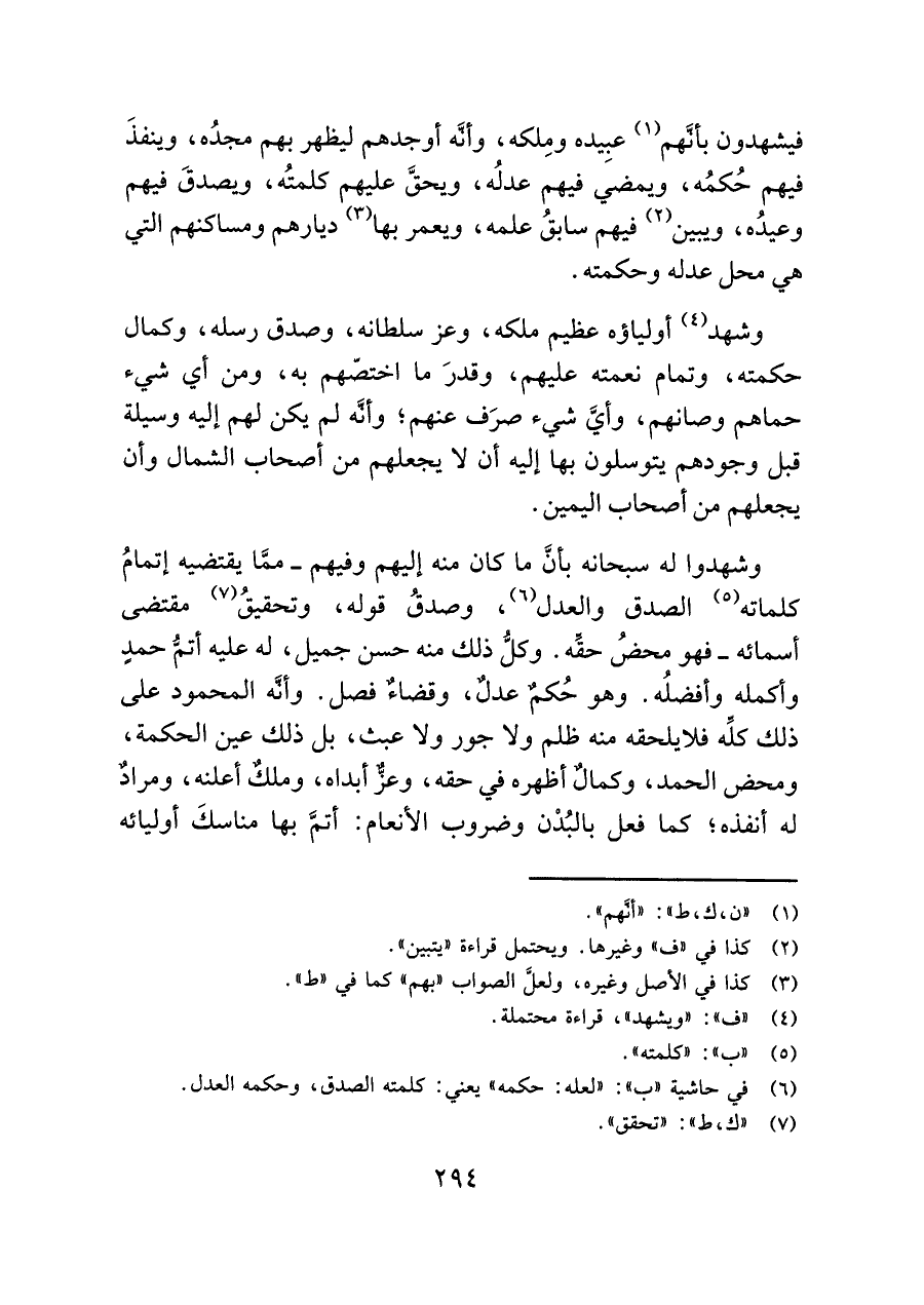 وشهد (¬٤) أولياؤه عظيم ملكه، وعز سلطانه، وصدق رسله، وكمال حكمته، وتمام نعمته عليهم، وقدرَ ما اختصّهم به، ومن أي شيء حماهم وصانهم، وأيَّ شيء صرَف عنهم؛ وأنَّه لم يكن لهم إليه وسيلة قبل وجودهم يتوسلون بها إليه أن لا يجعلهم من أصحاب الشمال وأن يجعلهم من أصحاب اليمين.