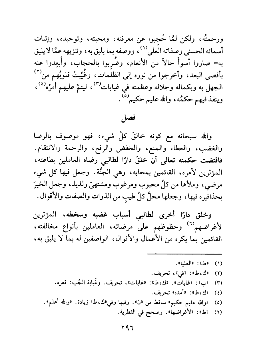 ورحمتُه، ولكن لمَّا حُجِبوا عن معرفته، ومحبته، وتوحيده، وإثبات أسمائه الحسنى وصفاته العلى (¬١)، ووصفه بما يليق به، وتنزيهه عمَّا يليق به = صاروا أسوأَ حالًا من الأنعام، وضُرِبوا بالحجاب، وأُبعِدوا عنه بأقصى البعد، وأخرجوا من نوره إلى الظلمات، وغُيِّبتْ قلوبُهم من (¬٢) الجهل به وبكماله وجلاله وعظمته في غيابات (¬٣)، ليتمَّ عليهم أمرُه (¬٤)، وينفذ فيهم حكمُه، واللَّه عليم حكيم (¬٥).