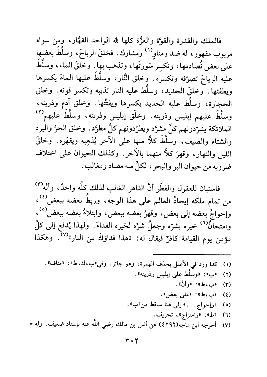 فاستبان للعقول والفطَر أنَّ القاهر الغالب لذلك كلِّه واحدٌ، وأنَّه (¬٣) من تمام ملكه إيجادُ العالم على هذا الوجه، وربطُ بعضه ببعض (¬٤)، وإحواجُ بعضه إلى بعض، وقهرُ بعضه ببعض، وابتلاءُ بعضه ببعض (¬٥)، وامتحانُ (¬٦) خيره بشرّه وجعلُ شره لغيره الفداءَ. ولهذا يُدفع إلى كلِّ مؤمن يوم القيامة كافرٌ فيقال له: "هذا فداؤكَ من النار" (¬٧). وهكذا