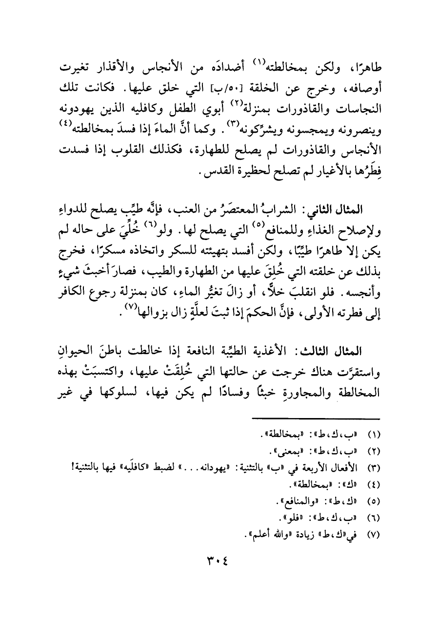 طاهرًا، ولكن بمخالطته (¬١) أضدادَه من الأنجاس والأقذار تغيرت أوصافه، وخرج عن الخلقة التي خلق عليها. فكانت تلك النجاسات والقاذورات بمنزلة (¬٢) أبوي الطفل وكافليه الذين يهودونه وينصرونه ويمجسونه ويشرِّكونه (¬٣). وكما أنَّ الماءَ إذا فسدَ بمخالطته (¬٤) الأنجاس والقاذورات لم يصلح للطهارة، فكذلك القلوب إذا فسدت فِطَرُها بالأغيار لم تصلح لحظيرة القدس.