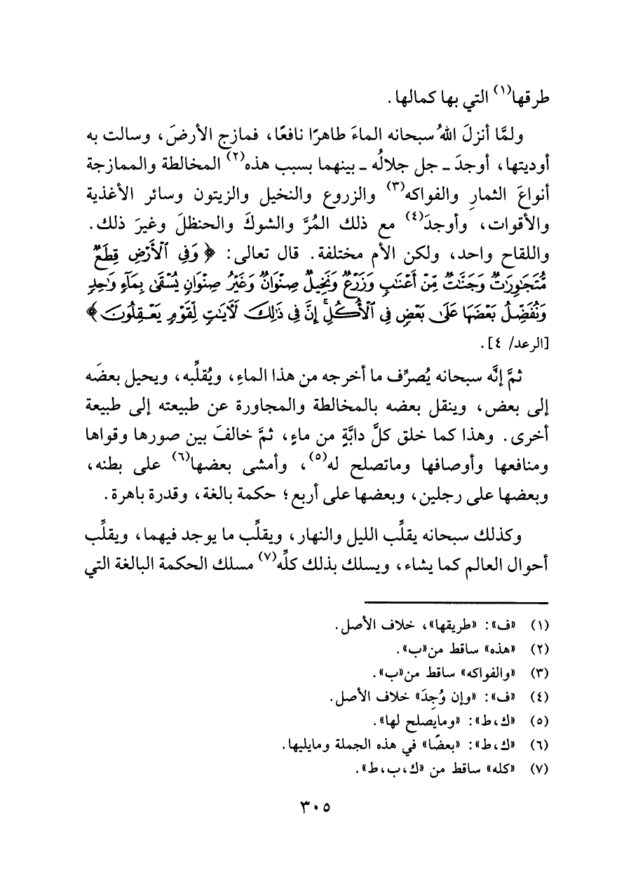 ثمَّ إنَّه سبحانه يُصرف ما أخرجه من هذا الماءِ، ويُقلِّبه، ويحيل بعضَه إلى بعض، وينقل بعضه بالمخالطة والمجاورة عن طبيعته إلى طبيعة أخرى. وهذا كما خلق كلَّ دابَّةٍ من ماءٍ، ثمَّ خالفَ بين صورها وقواها ومنافعها وأوصافها وما تصلح له (¬٥)، وأمشى بعضها (¬٦) على بطنه، وبعضها على رجلين، وبعضها على أربع؛ حكمة بالغة، وقدرة باهرة.