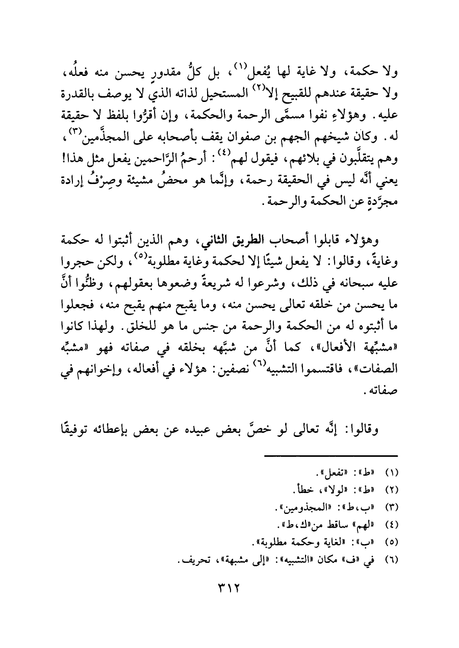 وهؤلاء قابلوا أصحاب الطريق الثاني، وهم الذين أثبتوا له حكمة وغايةً، وقالوا: لا يفعل شيئًا إلا لحكمة وغاية مطلوبة (¬٥)، ولكن حجروا عليه سبحانه في ذلك، وشرعوا له شريعةً وضعوها بعقولهم، وظنُّوا أنَّ ما يحسن من خلقه تعالى يحسن منه، وما يقبح منهم يقبح منه، فجعلوا ما أثبتوه له من الحكمة والرحمة من جنس ما هو للخلق. ولهذا كانوا "مشبِّهة الأفعال"، كما أنَّ من شبَّهه بخلقه في صفاته فهو "مشبِّه الصفات"، فاقتسموا التشبيه (¬٦) نصفين: هؤلاء في أفعاله، وإخوانهم في صفاته.