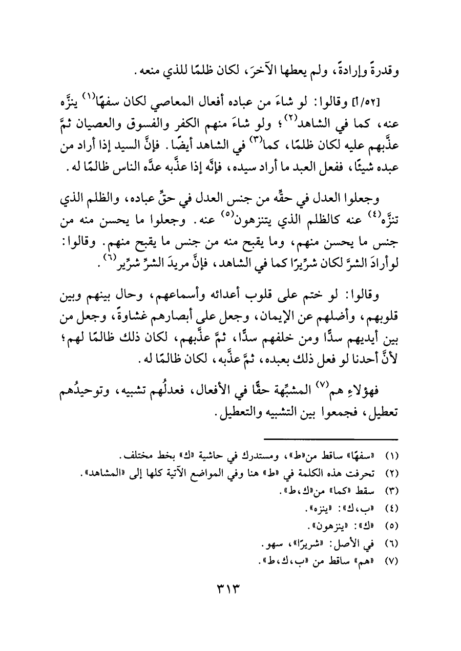 فهؤلاءِ هم (¬٧) المشبِّهة حقًّا في الأفعال، فعدلُهم تشبيه، وتوحيدُهم تعطيل، فجمعوا بين التشبيه والتعطيل.