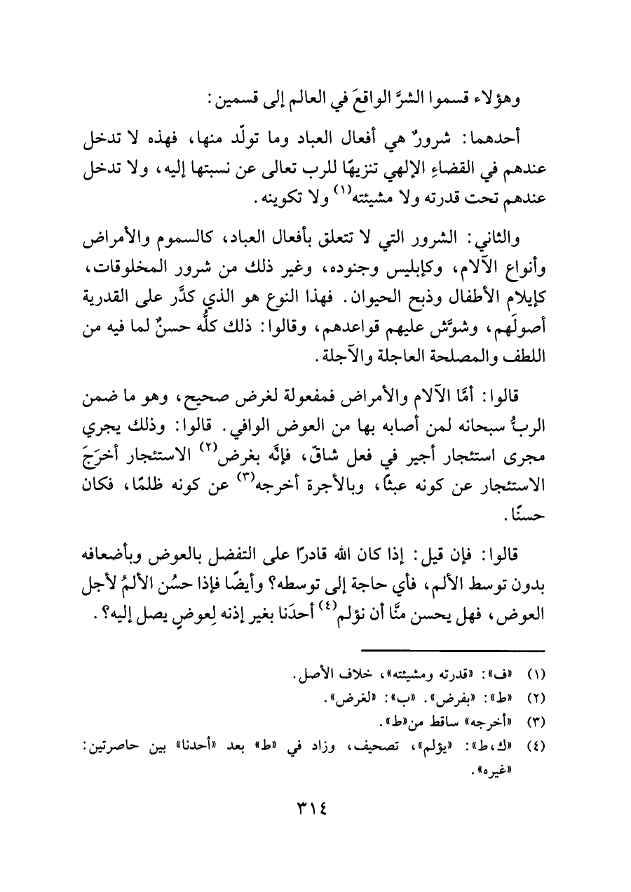 أحدهما: شرورٌ هي أفعال العباد وما تولّد منها، فهذه لا تدخل عندهم في القضاءِ الإلهي تنزيهًا للرب تعالى عن نسبتها إليه، ولا تدخل عندهم تحت قدرته ولا مشيئته (¬١) ولا تكوينه.