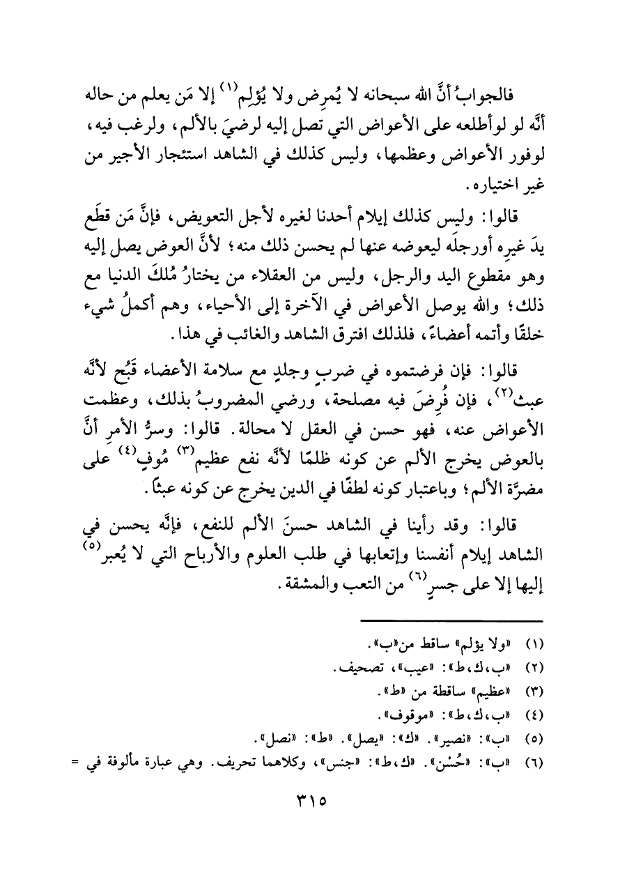 قالوا: وليس كذلك إيلام أحدنا لغيره لأجل التعويض، فإنَّ مَن قطَع يدَ غيرِه أو رجلَه ليعوضه عنها لم يحسن ذلك منه؛ لأنَّ العوض يصل إليه وهو مقطوع اليد والرجل، وليس من العقلاء من يختارُ مُلكَ الدنيا مع ذلك؛ واللَّه يوصل الأعواض في الآخرة إلى الأحياء، وهم أكملُ شيء خلقًا وأتمه أعضاءً، فلذلك افترق الشاهد والغائب في هذا.