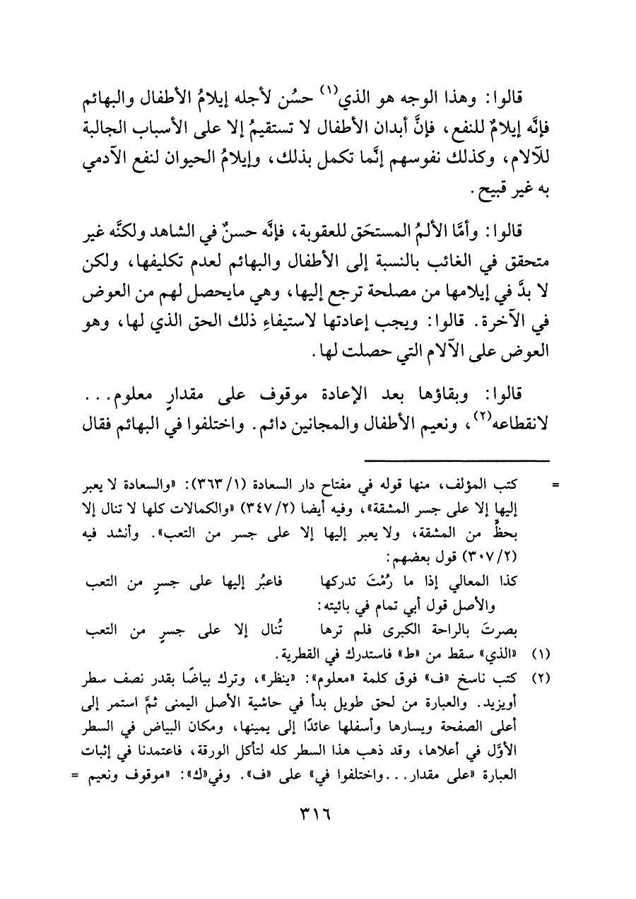 قالوا: وأمَّا الألمُ المستحَق للعقوبة، فإنَّه حسنٌ في الشاهد ولكنَّه غير متحقق في الغائب بالنسبة إلى الأطفال والبهائم لعدم تكليفها، ولكن لا بدَّ في إيلامها من مصلحة ترجع إليها، وهي ما يحصل لهم من العوض في الآخرة. قالوا: ويجب إعادتها لاستيفاءِ ذلك الحق الذي لها، وهو العوض على الآلام التي حصلت لها.