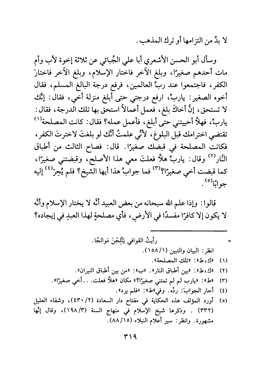 وسأل أبو الحسن الأشعري أبا علي الجُبائي عن ثلاثة إخوة لأب وأم مات أحدهم صغيرًا، وبلغ الآخر فاختار الإسلام، وبلغ الآخر فاختارَ الكفر، فاجتمعوا عند ربِّ العالمين، فرفع درجة البالغ المسلم، فقال أخوه الصغير: يا ربِّ، ارفع درجتي حتى أبلغ منزلة أخي، فقال: إنَّك لا تستحق، إنَّ أخاكَ بلغ، فعمل أعمالًا استحق بها تلك الدرجة، فقال: يا ربِّ، فهلَّا أحييتني حتى أبلغ، فأعمل عمله؟ فقال: كانت المصلحة (¬١) تقتضي اخترامك قبل البلوغ، لأنِّي علمتُ أنَّك لو بلغتَ لاخترتَ الكفر، فكانت المصلحة في قبضك صغيرًا. قال: فصاح الثالث من أطباق النَّار (¬٢) وقال: يا ربِّ هلَّا فعلتَ معي هذا الأصلح، وقبضتني صغيرًا، كما قبضت أخي صغيرًا؟ (¬٣) فما جوابُ هذا أيها الشيخ؟ فلم يُحِرْ (¬٤) إليه جوابًا (¬٥).