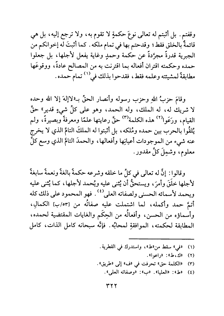 وقفتم. بل أثبتم له تعالى نوعَ حكمةٍ لا تقوم به، ولا ترجع إليه، بل هي قائمةٌ بالخلق فقط؛ وقد حتم بها في تمام ملكه. كما أثبتَ له إخوانكم من الجبرية قدرةً مجرَّدةً عن حكمة وحمدٍ وغاية يفعل لأجلها، بل جعلوا حمده وحكمته اقتران أفعاله بما اقترنت به من المصالح عادة، ووقوعَها مطابقةً لمشيئته وعلمه فقط، فقدحوا بذلك في (¬١) تمام حمده.