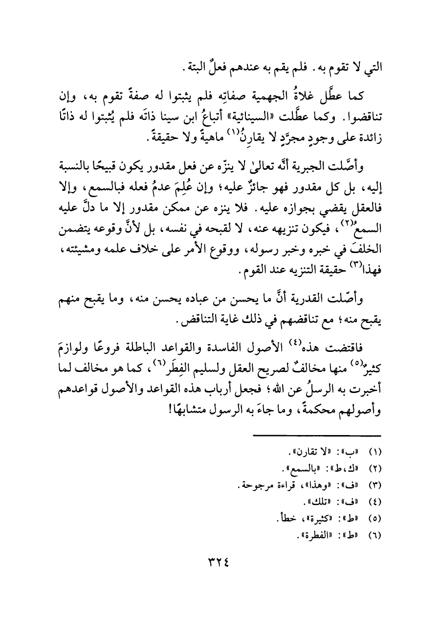 فاقتضت هذه (¬٤) الأصول الفاسدة والقواعد الباطلة فروعًا ولوازمَ كثيرٌ (¬٥) منها مخالفٌ لصريح العقل ولسليم الفِطَر (¬٦)، كما هو مخالف لما أخبرت به الرسلُ عن اللَّه؛ فجعل أرباب هذه القواعد والأصول قواعدهم وأصولهم محكمة، وما جاءَ به الرسول متشابهًا!