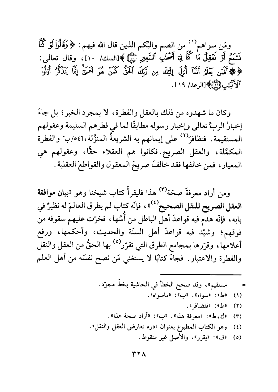 ومن أراد معرفةَ صحّة (¬٣) هذا فليقرأْ كتاب شيخنا وهو "بيان موافقة العقل الصريح للنقل الصحيح (¬٤) "، فإنّه كتاب لم يطرق العالمَ له نظيرٌ في بابه، فإنّه هدم فيه قواعدَ أهل الباطل من أُسِّها، فخرّت عليهم سقوفه من فوقهم؛ وشيّد فيه قواعدَ أهل السنّة والحديث، وأحكمها، ورفع أعلامها، وقرّرها بمجامع الطرق التي تقرّر (¬٥) بها الحق من العقل والنقل والفطرة والاعتبار. فجاءَ كتابًا لا يستغني مَن نصح نفسَه من أهل العلم