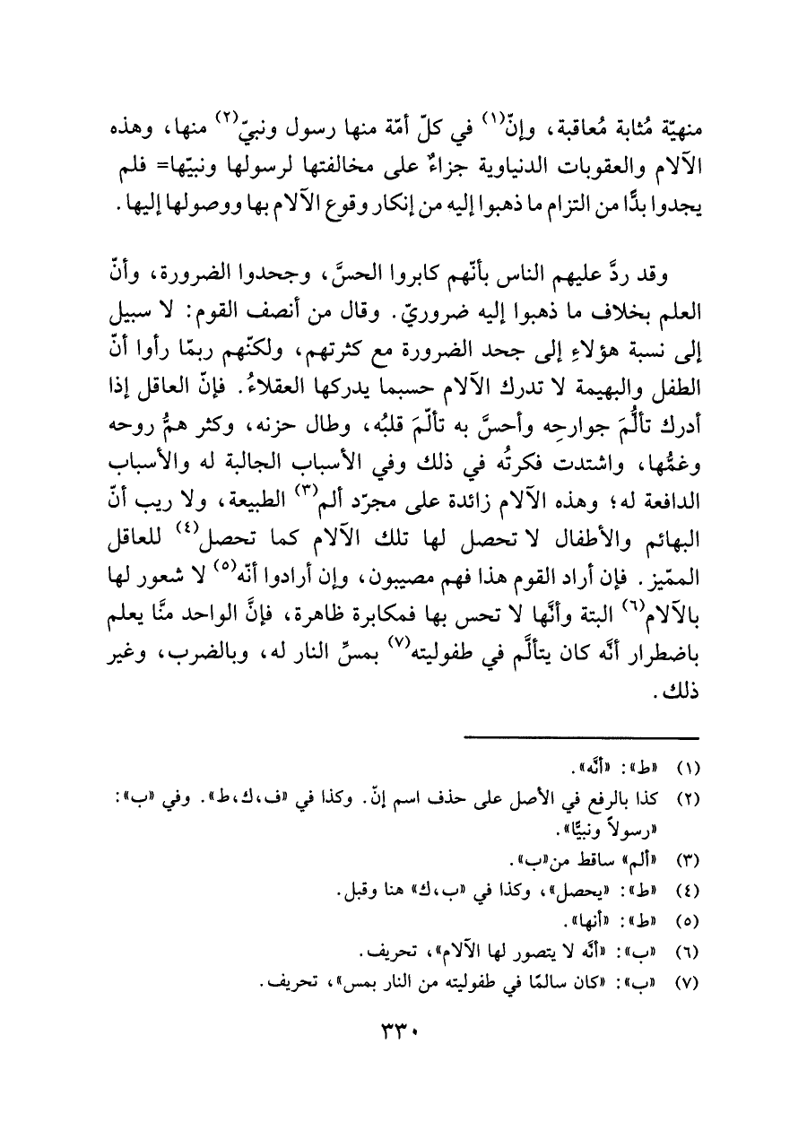 (¬٦) "ب": "أنَّه لا يتصور لها الآلام"، تحريف.