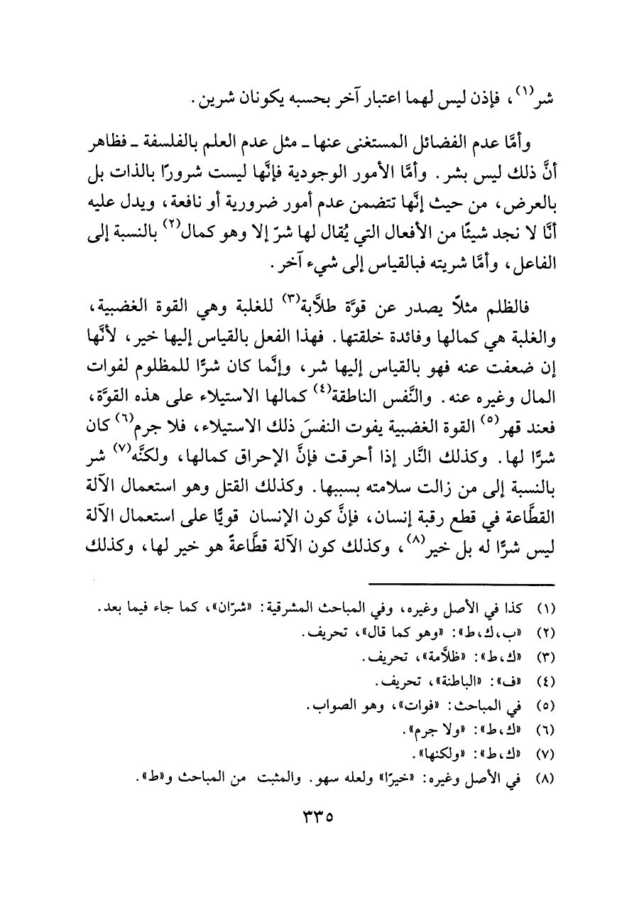 وأمَّا عدم الفضائل المستغنى عنها -مثل عدم العلم بالفلسفة- فظاهر أنَّ ذلك ليس بشر. وأمَّا الأمور الوجودية فإنَّها ليست شرورًا بالذات بل بالعرض، من حيث إنَّها تتضمن عدم أمور ضرورية أو نافعة، ويدل عليه أنَّا لا نجد شيئًا من الأفعال التي يُقال لها شرّ إلا وهو كمال (¬٢) بالنسبة إلى الفاعل، وأمَّا شريته فبالقياس إلى شيء آخر.