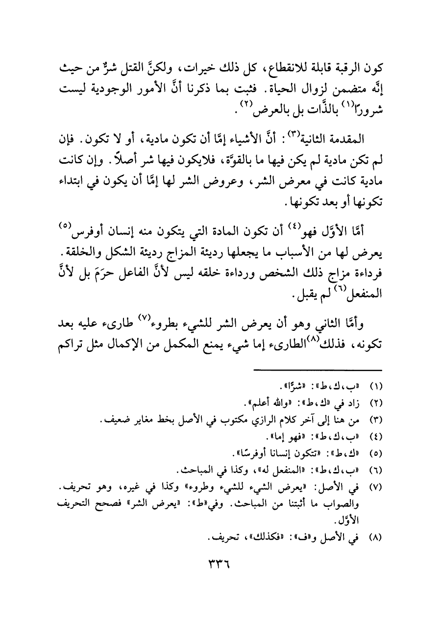 (¬٧) في الأصل: "يعرض الشيء للشيء وطروء" وكذا في غيره، وهو تحريف. والصواب ما أثبتنا من المباحث. وفي "ط": "يعرض الشر" فصحح التحريف الأوَّل.