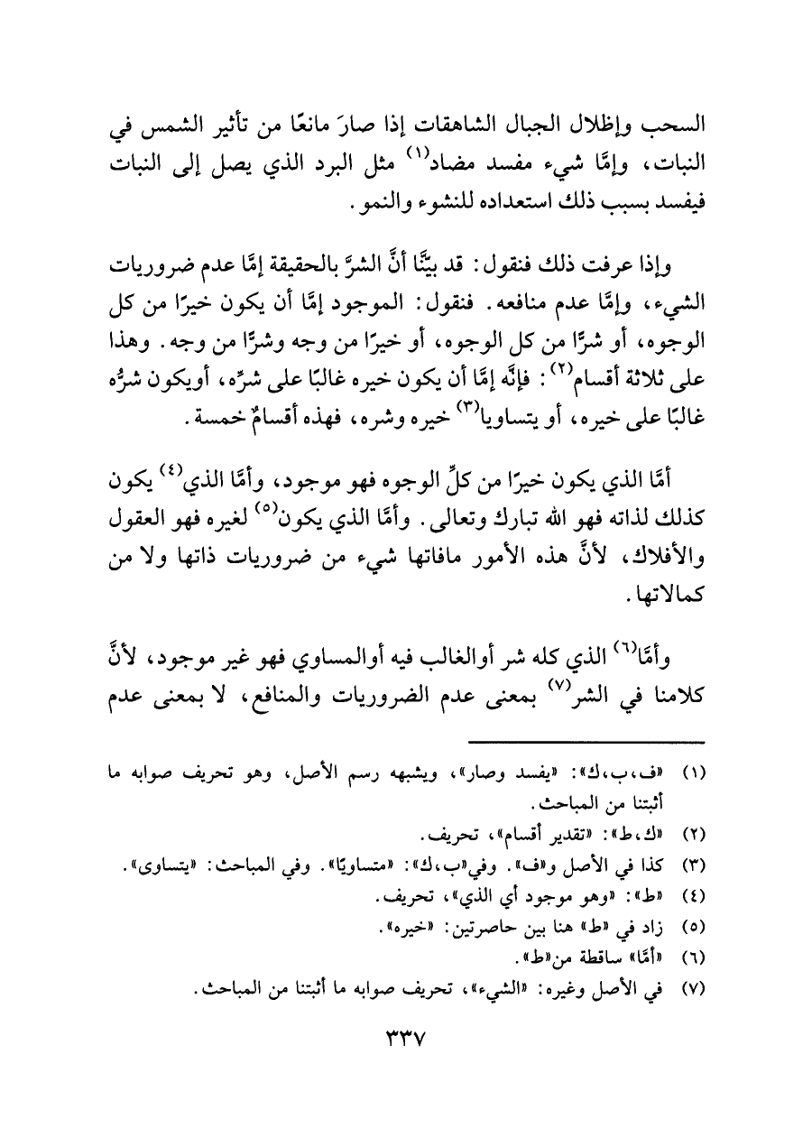 وإذا عرفت ذلك فنقول: قد بيّنَّا أنَّ الشرَّ بالحقيقة إمَّا عدم ضروريات الشيء، وإمَّا عدم منافعه. فنقول: الموجود إمَّا أن يكون خيرًا من كل الوجوه، أو شرًّا من كل الوجوه، أو خيرًا من وجه وشرًّا من وجه. وهذا على ثلاثة أقسام (¬٢): فإنَّه إمَّا أن يكون خيره غالبًا على شرِّه، أو يكون شرُّه غالبًا على خيره، أو يتساويا (¬٣) خيره وشره، فهذه أقسامٌ خمسة.