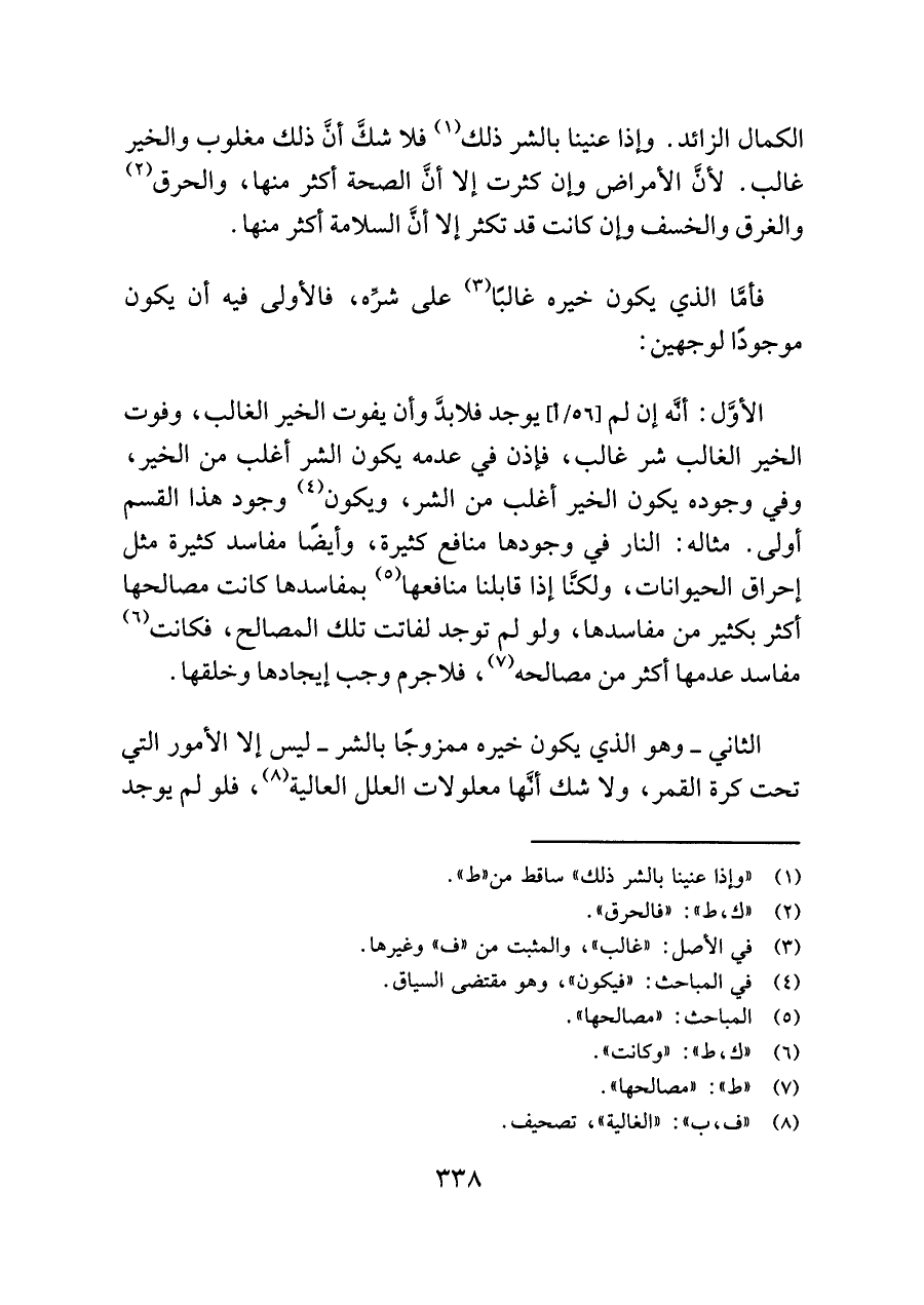 الأوَّل: أنَّه إن لم يوجد فلا بدَّ وأن يفوت الخير الغالب، وفوت الخير الغالب شر غالب، فإذن في عدمه يكون الشر أغلب من الخير، وفي وجوده يكون الخير أغلب من الشر، ويكون (¬٤) وجود هذا القسم أولى. مثاله: النار في وجودها منافع كثيرة، وأيضًا مفاسد كثيرة مثل إحراق الحيوانات، ولكنَّا إذا قابلنا منافعها (¬٥) بمفاسدها كانت مصالحها أكثر بكثير من مفاسدها، ولو لم توجد لفاتت تلك المصالح، فكانت (¬٦) مفاسد عدمها أكثر من مصالحه (¬٧)، فلا جرم وجب إيجادها وخلقها.