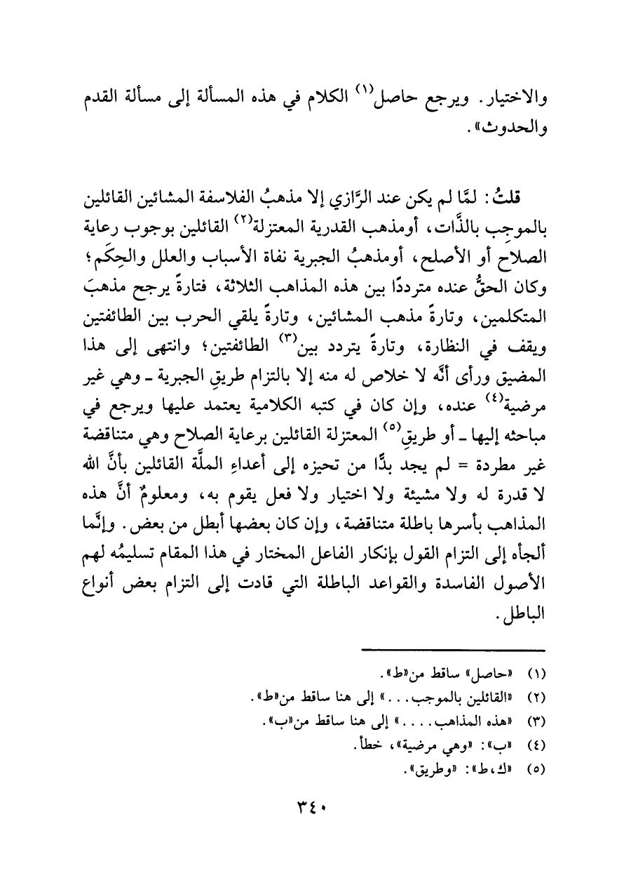قلتُ: لمَّا لم يكن عند الرَّازي إلا مذهبُ الفلاسفة المشائين القائلين بالموجِب بالذات، أومذهب القدرية المعتزلة (¬٢) القائلين بوجوب رعاية الصلاح أو الأصلح، أو مذهبُ الجبرية نفاة الأسباب والعلل والحِكَم؛ وكان الحقُّ عنده مترددًا بين هذه المذاهب الثلاثة، فتارةً يرجح مذهبَ المتكلمين، وتارةً مذهب المشائين، وتارةً يلقي الحرب بين الطائفتين ويقف في النظارة، وتارةً يتردد بين (¬٣) الطائفتين؛ وانتهى إلى هذا المضيق ورأى أنَّه لا خلاص له منه إلا بالتزام طريقِ الجبرية -وهي غير مرضية (¬٤) عنده، وإن كان في كتبه الكلامية يعتمد عليها ويرجع في مباحثه إليها- أو طريقِ (¬٥) المعتزلة القائلين برعاية الصلاح وهي متناقضة غير مطردة = لم يجد بدًّا من تحيزه إلى أعداءِ الملَّة القائلين بأنَّ اللَّه لا قدرة له ولا مشيئة ولا اختيار ولا فعل يقوم به، ومعلومٌ أنَّ هذه المذاهب بأسرها باطلة متناقضة، وإن كان بعضها أبطل من بعض. وإنَّما ألجأه إلى التزام القول بإنكار الفاعل المختار في هذا المقام تسليمُه لهم الأصول الفاسدة والقواعد الباطلة التي قادت إلى التزام بعض أنواع الباطل.