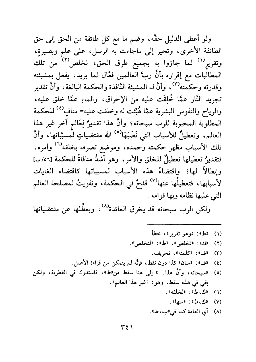 ولو أعطى الدليل حقَّه، وضم ما مع كل طائفة من الحق إلى حق الطائفة الأخرى، وتحيز إلى ما جاءت به الرسل، على علم وبصيرةٍ، وتقريرٍ (¬١) لما جاؤوا به بجميع طرق الحق، لخلص (¬٢) من تلك المطالبات مع إقراره بأنَّ ربَّ العالمين فعَّال لما يريد، يفعل بمشيئته وقدرته وحكمته (¬٣)، وأنَّ له المشيئة النَّافذة والحكمة البالغة، وأنَّ تقدير تجريد النَّار عمَّا خُلِقَت عليه من الإحراق، والماءِ عمَّا خلق عليه، والرياح والنفوس البشرية عمَّا هُيِّئت له وخلقت عليه = منافٍ (¬٤) للحكمة المطلوبة المحبوبة للرب سبحانه؛ وأنَّ هذا تقدير لِعَالمٍ آخر غير هذا العالم، وتعطيلٌ للأسباب التي نَصَبَهَا (¬٥) اللَّه مقتضياتٍ لمسبَّباتها، وأنَّ