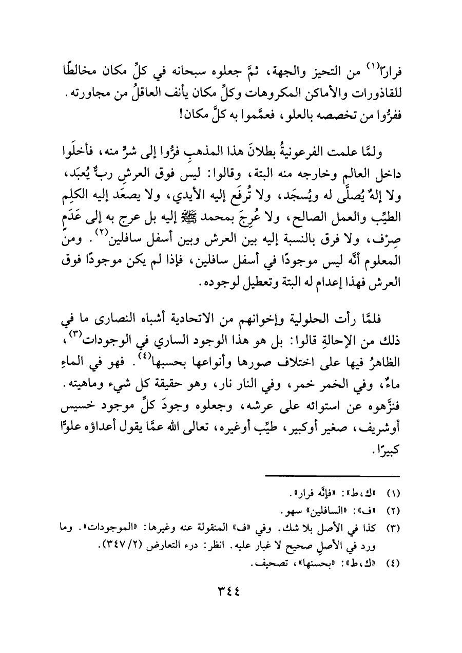 ولمَّا علمت الفرعونيةُ بطلانَ هذا المذهبِ فرُّوا إلى شرٍّ منه، فأخلَوا داخل العالم وخارجه منه البتة، وقالوا: ليس فوق العرشِ ربٌّ يُعبَد، ولا إلهٌ يُصلَّى له ويُسجَد، ولا تُرفَع إليه الأيدي، ولا يصعَد إليه الكلِم الطيِّب والعمل الصالح، ولا عُرِجَ بمحمد -صلى اللَّه عليه وسلم- إليه بل عرج به إلى عَدَمٍ صِرْف، ولا فرق بالنسبة إليه بين العرش وبين أسفل سافلين (¬٢). ومن المعلوم أنَّه ليس موجودًا في أسفل سافلين، فإذا لم يكن موجودًا فوق العرش فهذا إعدام له البتة وتعطيل لوجوده.