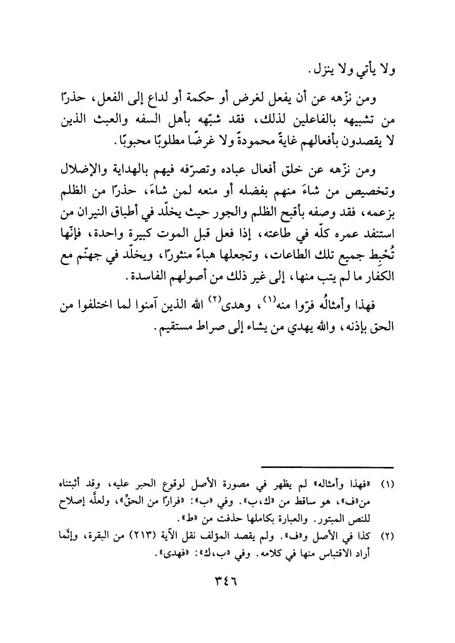 ومن نزّهه عن أن يفعل لغرض أو حكمة أو لداع إلى الفعل، حذرًا من تشبيهه بالفاعلين لذلك، فقد شبّهه بأهل السفه والعبث الذين لا يقصدون بأفعالهم غايةً محمودةً ولا غرضًا مطلوبًا محبوبًا.