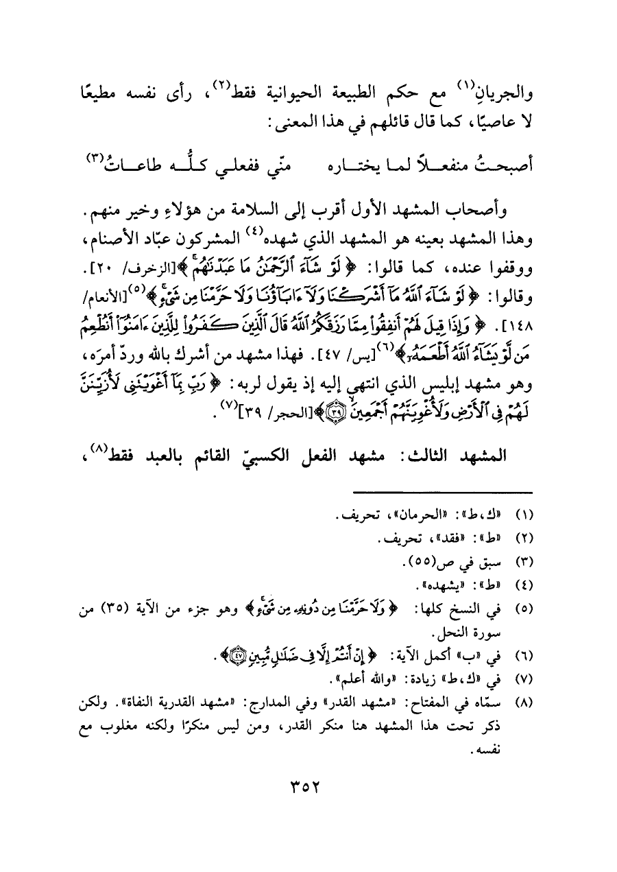 (¬٨) سمّاه في المفتاح: "مشهد القدر" وفي المدارج: "مشهد القدرية النفاة". ولكن ذكر تحت هذا المشهد هنا منكر القدر، ومن ليس منكرًا ولكنه مغلوب مع نفسه.