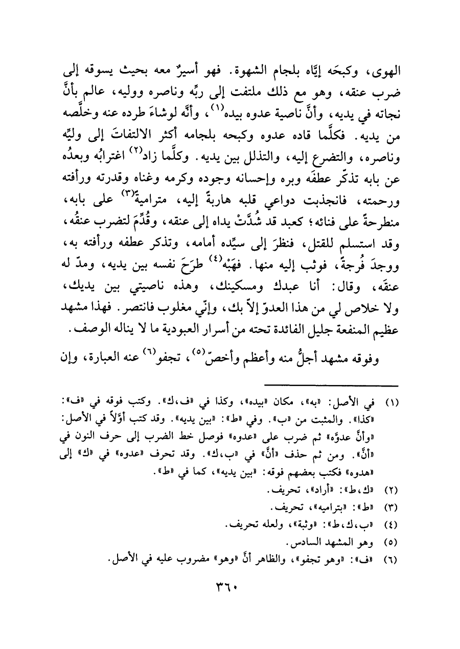 الهوى، وكبحَه إيَّاه بلجام الشهوة. فهو أسير معه بحيث يسوقه إلى ضرب عنقه، وهو مع ذلك ملتفت إلى ربِّه وناصره ووليه، عالم بأنَّ نجاته في يديه، وأنَّ ناصية عدوه بيده (¬١)، وأنَّه لو شاءَ طرده عنه وخلّصه من يديه. فكلَّما قاده عدوه وكبحه بلجامه أكثر الالتفاتَ إلى وليِّه وناصره، والتضرع إليه، والتذلل بين يديه. وكلَّما زاد (¬٢) اغترابُه وبعدُه عن بابه تذكر عطفَه وبره وإحسانه وجوده وكرمه وغناه وقدرته ورأفته ورحمته، فانجذبت دواعي قلبه هاربةً إليه، متراميةً (¬٣) على بابه، منطرحةً على فنائه؛ كعبد قد شُدَّتْ يداه إلى عنقه، وقُدِّمَ لتضرب عنقُه، وقد استسلمٍ للقتل، فنظرَ إلى سيِّده أمامه، وتذكر عطفه ورأفته به، ووجدَ فُرجةً، فوثب إليه منها. فهَبْه (¬٤) طرَحَ نفسه بين يديه، ومدّ له عنقَه، وقال: أنا عبدك ومسكينك، وهذه ناصيتي بين يديك، ولا خلاص لي من هذا العدوّ إلّا بك، وإني مغلوب فانتصر. فهذا مشهد عظيم المنفعة جليل الفائدة تحته من أسرار العبودية ما لا يناله الوصف.