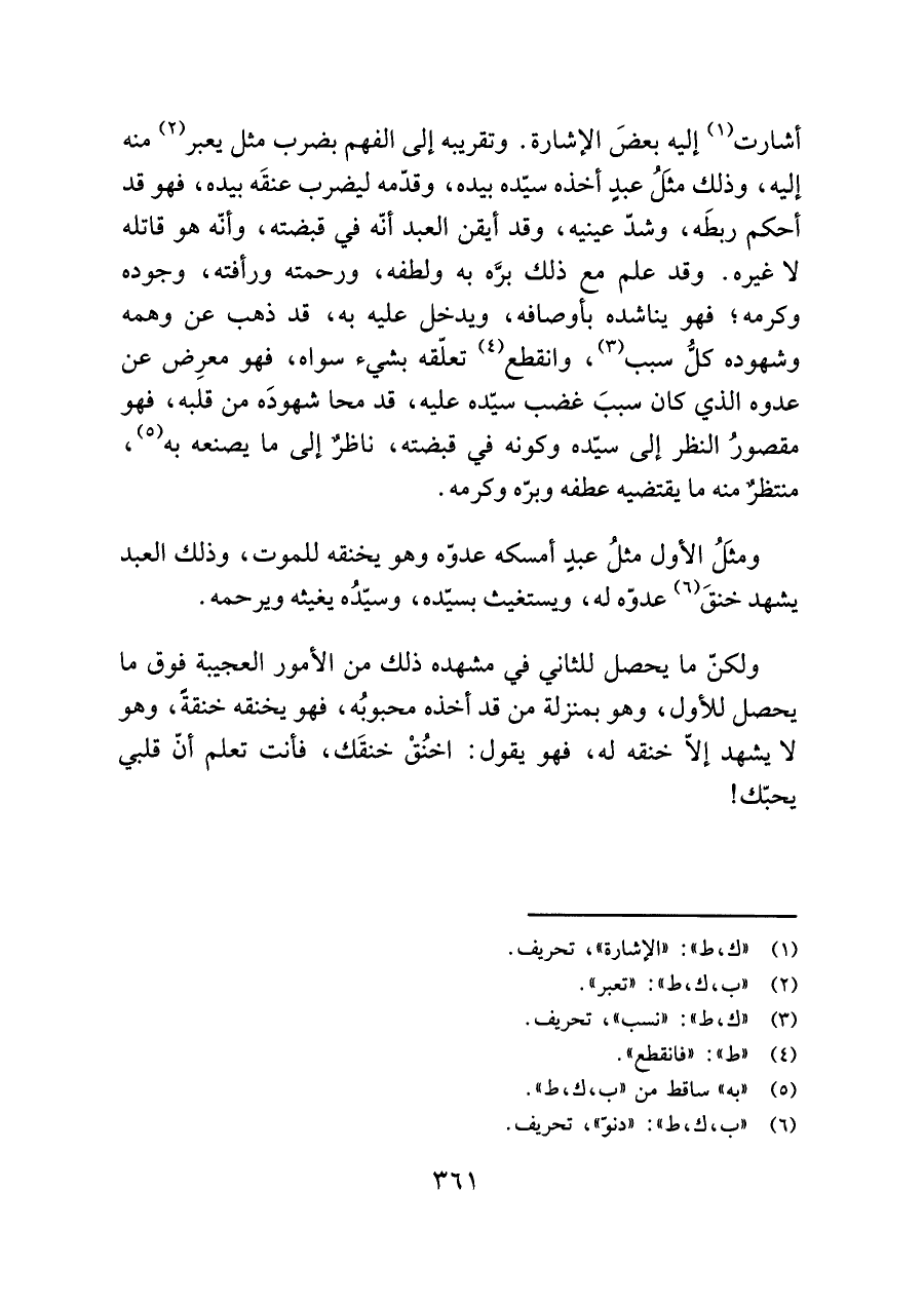 ولكنّ ما يحصل للثاني في مشهده ذلك من الأمور العجيبة فوق ما يحصل للأول، وهو بمنزلة من قد أخذه محبوبُه، فهو يخنقه خنقةً، وهو لا يشهد إلَّا خنقه له، فهو يقول: اخنُقْ خنقَك، فأنت تعلم أنّ قلبي يحبّك!