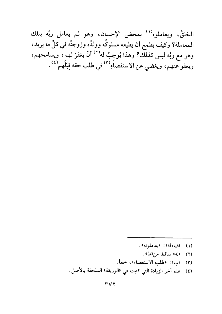 الخلقُ، ويعاملوه (¬١) بمحض الإحسان، وهو لم يعامل ربَّه بتلك المعاملة؟ وكيف يطمع أن يطيعه مملوكُه وولدُه وزوجتُه في كلِّ ما يريد، وهو مع ربِّه ليس كذلك؟ وهذا يُوجِبُ له (¬٢) أنْ يغفرَ لهمِ، ويسامحهم، ويعفو عنهم، ويغضي عن الاستقصاءِ (¬٣) في طلب حقه قِبَلهم (¬٤).