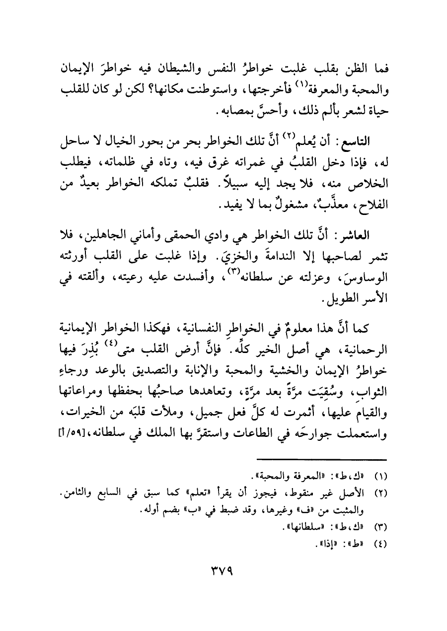 التاسع: أن يُعلم (¬٢) أنَّ تلك الخواطر بحر من بحور الخيال لا ساحل له، فإذا دخل القلبُ في غمراته غرق فيه، وتاه في ظلماته، فيطلب الخلاص منه، فلا يجد إليه سبيلًا. فقلبٌ تملكه الخواطر بعيدٌ من الفلاح، معذَّبٌ، مشغولٌ بما لا يفيد.
