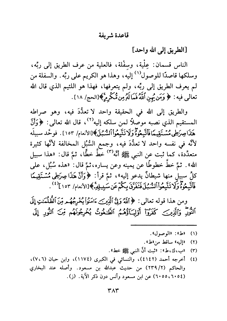 والطريق إلى اللَّه في الحقيقة واحد لا تعدُّدَ فيه، وهو صراطه المستقيم الذي نصبه موصلًا لمن سلكه إليه (¬٢)، قال اللَّه تعالى: {وَأَنَّ هَذَا صِرَاطِي مُسْتَقِيمًا فَاتَّبِعُوهُ وَلَا تَتَّبِعُوا السُّبُلَ} [الأنعام/ ١٥٣]. فوحَّد سبيلَه لأنَّه في نفسه واحد لا تعدُّدَ فيه، وجمع السُّبُل المخالفة لأنَّها كثيرة متعدِّدة، كما ثبت عن النبي -صلى اللَّه عليه وسلم- أنَّه (¬٣) خطَّ خطًّا، ثُمَّ قال: "هذا سبيل اللَّه". ثُمَّ خطَّ خطوطًا عن يمينه وعن يساره، ثُمَّ قال: "هذه سُبُل، على كلِّ سبيلٍ منها شيطانٌ يدعو إليه"، ثُمَّ قرأ: {وَأَنَّ هَذَا صِرَاطِي مُسْتَقِيمًا فَاتَّبِعُوهُ وَلَا تَتَّبِعُوا السُّبُلَ فَتَفَرَّقَ بِكُمْ عَنْ سَبِيلِهِ} [الأنعام/ ١٥٣] (¬٤).