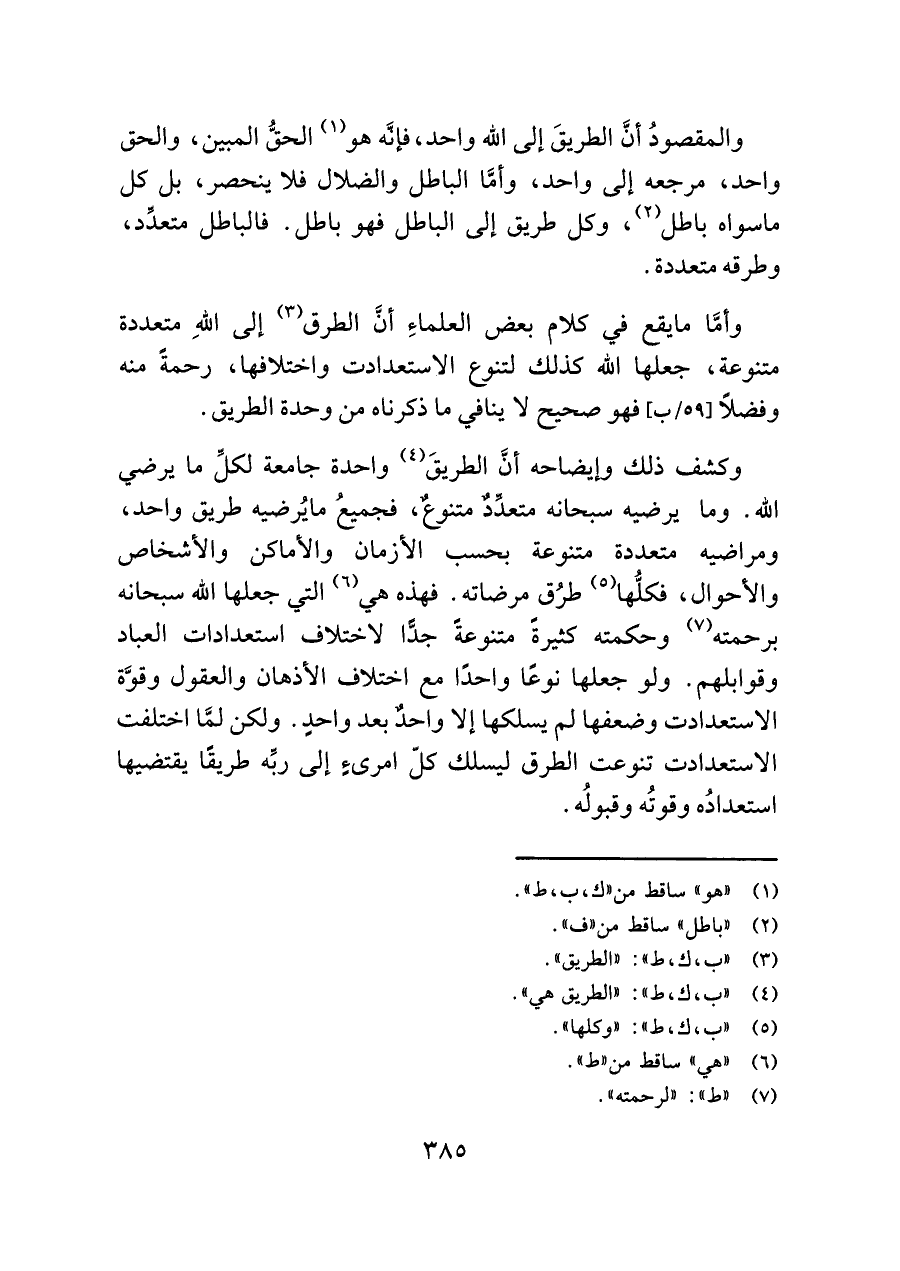 وأمَّا ما يقع في كلام بعض العلماءِ أنَّ الطرق (¬٣) إلى اللَّهِ متعددة متنوعة، جعلها اللَّه كذلك لتنوع الاستعدادت واختلافها، رحمةً منه وفضلًا فهو صحيح لا ينافي ما ذكرناه من وحدة الطريق.