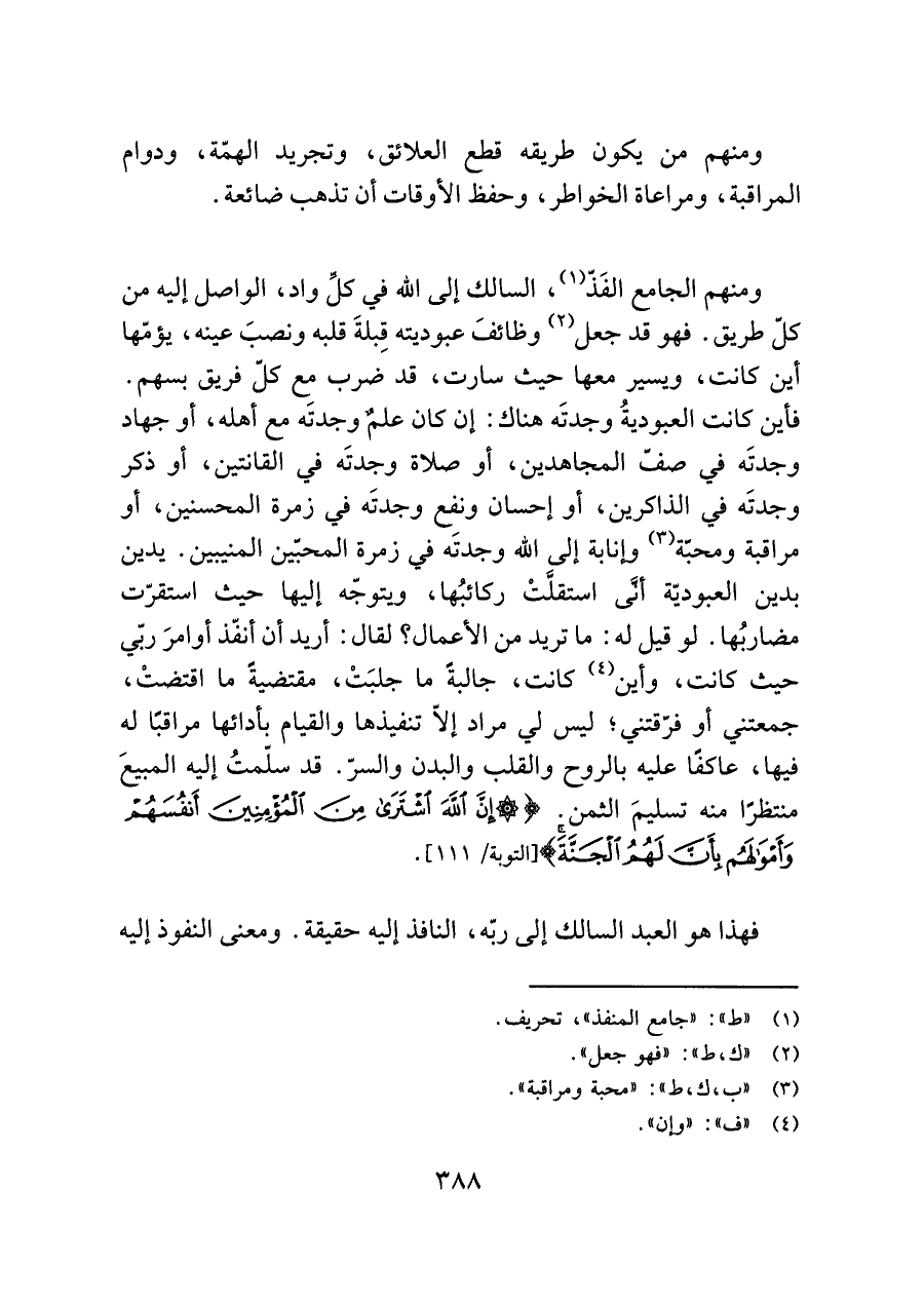 ومنهم الجامع الفَذّ (¬١)، السالك إلى اللَّه في كلِّ واد، الواصل إليه من كلّ طريق. فهو قد جعل (¬٢) وظائفَ عبوديته قِبلةَ قلبه ونصبَ عينه، يؤمّها أين كانت، ويسير معها حيث سارت، قد ضرب مع كلّ فريق بسهم. فأين كانت العبوديةُ وجدتَه هناك: إن كان علمٌ وجدتَه مع أهله، أو جهاد وجدتَه في صفّ المجاهدين، أو صلاة وجدتَه في القانتين، أو ذكر وجدتَه في الذاكرين، أو إحسان ونفع وجدتَه في زمرة المحسنين، أو مراقبة ومحبّة (¬٣) وإنابة إلى اللَّه وجدتَه في زمرة المحبّين المنيبين. يدين بدين العبوديّة أنَّى استقلَّتْ ركائبُها، ويتوجّه إليها حيث استقرّت مضاربُها. لو قيل له: ما تريد من الأعمال؟ لقال: أريد أن أنفّذ أوامرَ ربّي حيث كانت، وأين (¬٤) كانت، جالبةً ما جلبَتْ، مقتضيةً ما اقتضتْ، جمعتني أو فرّقتني؛ ليس لي مراد إلَّا تنفيذها والقيام بأدائها مراقبًا له فيها، عاكفًا عليه بالروح والقلب والبدن والسرّ. قد سلّمتُ إليه المبيعَ منتظرًا منه تسليمَ الثمن. {إِنَّ اللَّهَ اشْتَرَى مِنَ الْمُؤْمِنِينَ أَنْفُسَهُمْ وَأَمْوَالَهُمْ بِأَنَّ لَهُمُ الْجَنَّةَ} [التوبة/ ١١١].