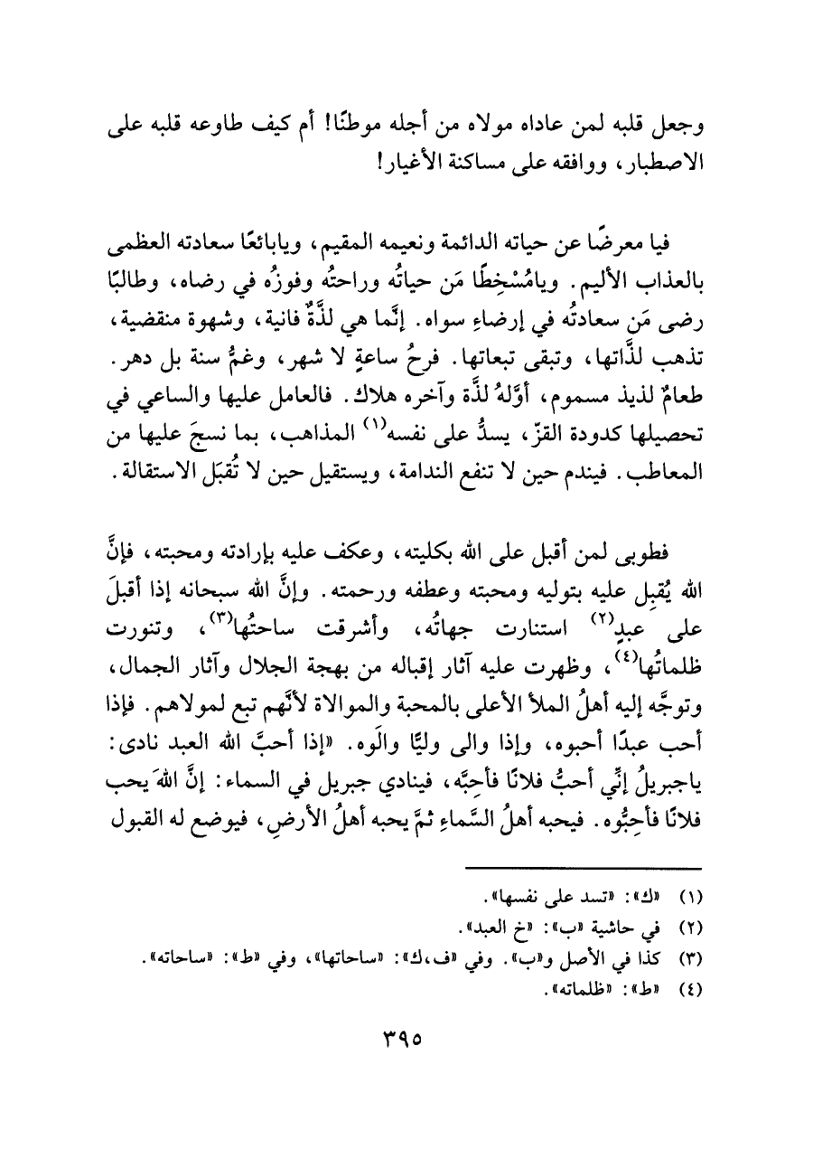 فطوبى لمن أقبل على اللَّه بكليته، وعكف عليه بإرادته ومحبته، فإنَّ اللَّه يُقبِل عليه بتوليه ومحبته وعطفه ورحمته. وإنَّ اللَّه سبحانه إذا أقبلَ على عبدٍ (¬٢) استنارت جهاتُه، وأشرقت ساحتُها (¬٣)، وتنورت ظلماتُها (¬٤)، وظهرت عليه آثار إقباله من بهجة الجلال وآثار الجمال، وتوجَّه إليه أهلُ الملأ الأعلى بالمحبة والموالاة لأنَّهم تبع لمولاهم. فإذا أحب عبدًا أحبوه، وإذا والى وليًّا والَوه. "إذا أحبَّ اللَّه العبد نادى: يا جبريلُ إنِّي أحبُّ فلانًا فأحِبَّه، فينادي جبريل في السماء: إنَّ اللَّهَ يحب فلانًا فأحِبُّوه. فيحبه أهلُ السَّماءِ ثُمَّ يحبه أهلُ الأرضِ، فيوضع له القبول