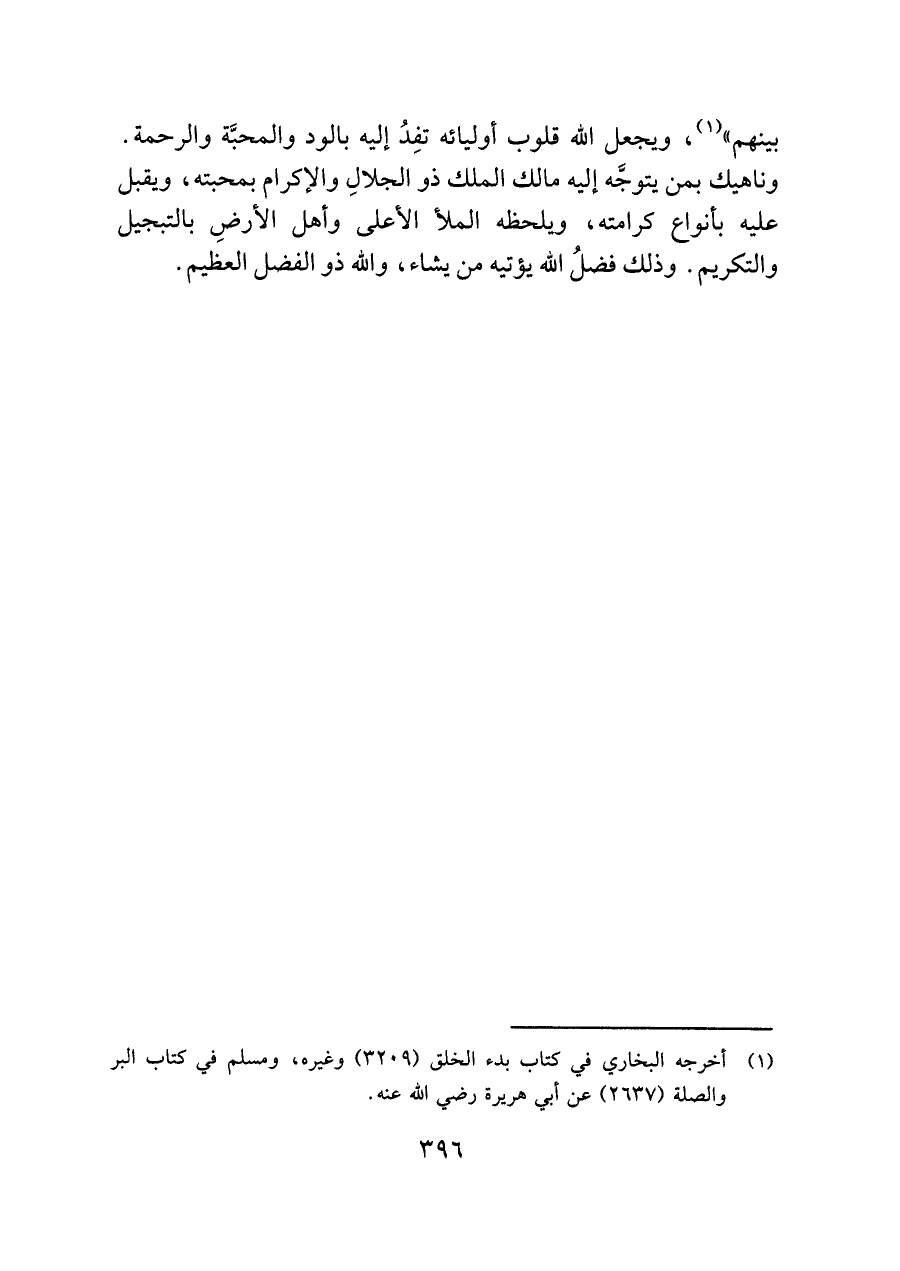بينهم" (¬١)، ويجعل اللَّه قلوب أوليائه تفِدُ إليه بالود والمحبَّة والرحمة. وناهيك بمن يتوجَّه إليه مالك الملك ذو الجلالِ والإكرام بمحبته، ويقبل عليه بأنواع كرامته، ويلحظه الملأ الأعلى وأهل الأرضِ بالتبجيل والتكريم. وذلك فضلُ اللَّه يؤتيه من يشاء، واللَّه ذو الفضل العظيم.
