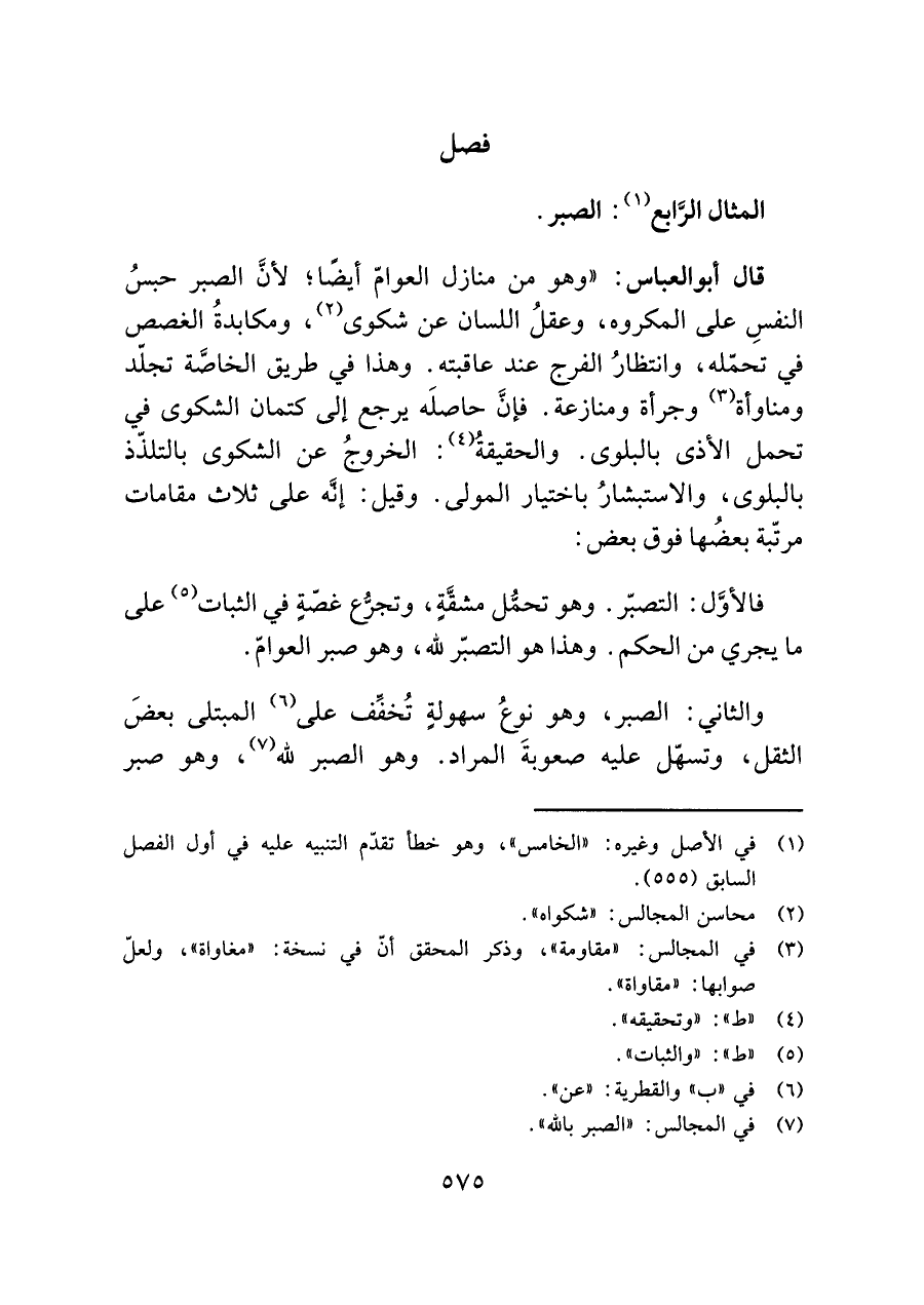 قال أبو العباس: "وهو من منازل العوامّ أيضًا؛ لأنَّ الصبر حبسُ النفسِ على المكروه، وعقلُ اللسان عن شكوى (¬٢)، ومكابدةُ الغصص في تحمّله، وانتظارُ الفرج عند عاقبته. وهذا في طريق الخاصَّة تجلّد ومناوأة (¬٣) وجرأة ومنازعة. فإنَّ حاصلَه يرجع إلى كتمان الشكوى في تحمل الأذى بالبلوى. والحقيقةُ (¬٤): الخروجُ عن الشكوى بالتلذّذ بالبلوى، والاستبشارُ باختيار المولى. وقيل: إنَّه على ثلاث مقامات مرتّبة بعضُها فوق بعض: