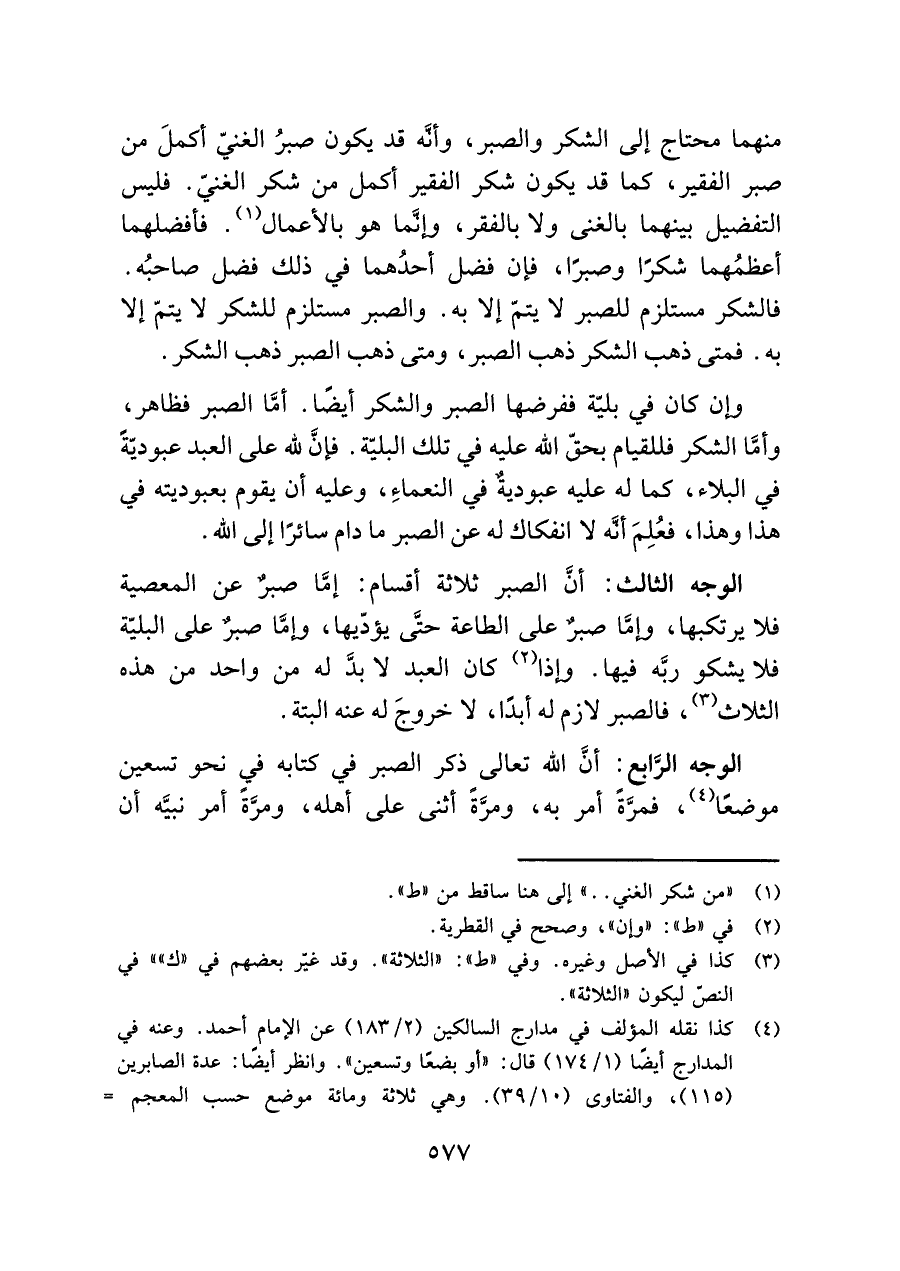 وإن كان في بليّة ففرضها الصبر والشكر أيضًا. أمَّا الصبر فظاهر، وأمَّا الشكر فللقيام بحقّ اللَّه عليه في تلك البليّة. فإنَّ للَّه على العبد عبوديّةً في البلاء، كما له عليه عبوديةٌ في النعماءِ، وعليه أن يقوم بعبوديته في هذا وهذا، فعُلِمَ أنَّه لا انفكاك له عن الصبر ما دام سائرًا إلى اللَّه.