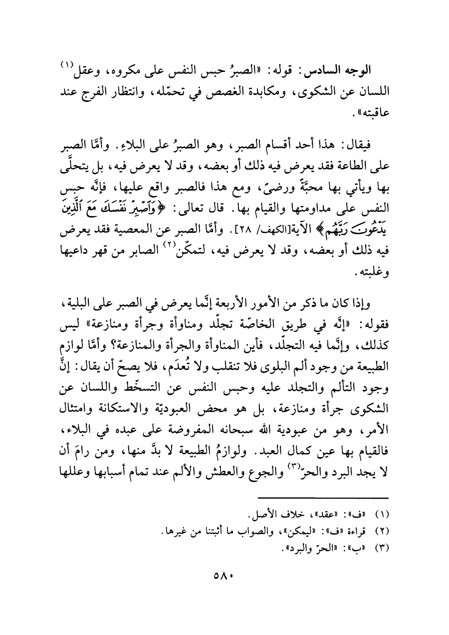 وإذا كان ما ذكر من الأمور الأربعة إنَّما يعرض في الصبر على البلية، فقوله: "إنَّه في طريق الخاصّة تجلّد ومناوأة وجرأة ومنازعة" ليس كذلك، وإنَّما فيه التجلّد، فأين المناوأة والجرأة والمنازعة؟ وأمَّا لوازم الطبيعة من وجود ألم البلوى فلا تنقلب ولا تُعدَم، فلا يصحّ أن يقال: إنَّ وجود التألم والتجلد عليه وحبس النفس عن التسخّط واللسان عن الشكوى جرأة ومنازعة، بل هو محض العبوديّة والاستكانة وامتثال الأمر، وهو من عبودية اللَّه سبحانه المفروضة على عبده في البلاء، فالقيام بها عين كمال العبد. ولوازمُ الطبيعة لا بدَّ منها، ومن رامَ أن لا يجد البرد والحرّ (¬٣) والجوع والعطش والألم عند تمام أسبابها وعللها