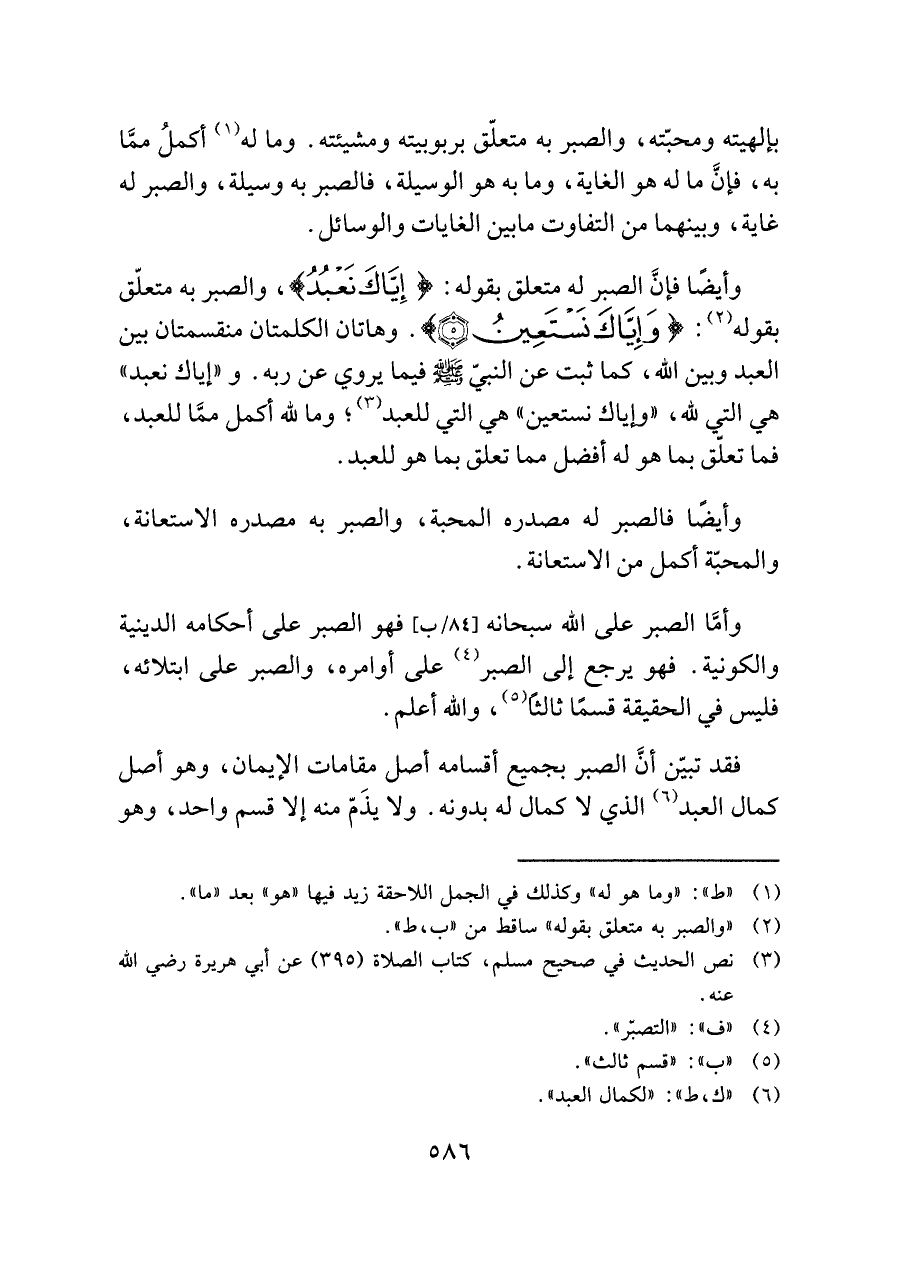 وأيضًا فإنَّ الصبر له متعلق بقوله: {إِيَّاكَ نَعْبُدُ}، والصبر به متعلّق بقوله (¬٢): {وَإِيَّاكَ نَسْتَعِينُ (٥)}. وهاتان الكلمتان منقسمتان بين العبد وبين اللَّه، كما ثبت عن النبيّ -صلى اللَّه عليه وسلم- فيما يروي عن ربه. و"إياك نعبد" هي التي للَّه، "وإياك نستعين" هي التي للعبد (¬٣)؛ وما للَّه أكمل ممَّا للعبد، فما تعلّق بما هو له أفضل مما تعلق بما هو للعبد.