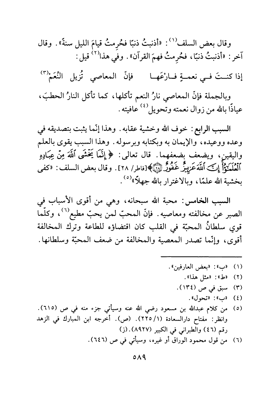 (¬٥) من كلام عبد اللَّه بن مسعود رضي اللَّه عنه وسيأتي جزء منه في ص (٦١٥). وانظر: مفتاح دار السعادة (١/ ٢٢٥). (ص). أخرجه ابن المبارك في الزهد رقم (٤٦) والطبراني في الكبير (٨٩٢٧). (ز)