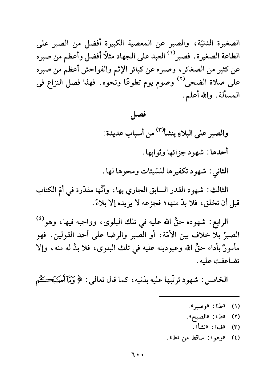 الصغيرة الدنيّة، والصبر عن المعصية الكبيرة أفضل من الصبر على الطاعة الصغيرة. فصبر (¬١) العبد على الجهاد مثلًا أفضل وأعظم من صبره عن كثير من الصغائر، وصبره عن كبائر الإثم والفواحش أعظم من صبره على صلاة الضحى (¬٢) وصوم يوم تطوعًا ونحوه. فهذا فصل النزاع في المسألة. واللَّه أعلم.