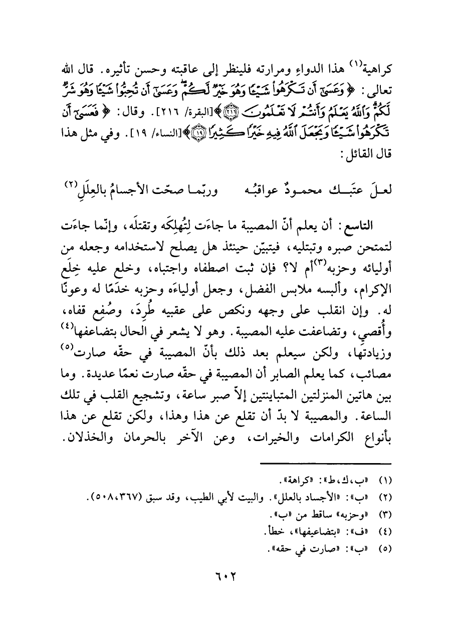 كراهية (¬١) هذا الدواءِ ومرارته فلينظر إلى عاقبته وحسن تأثيره. قال اللَّه تعالى: {وَعَسَى أَنْ تَكْرَهُوا شَيْئًا وَهُوَ خَيْرٌ لَكُمْ وَعَسَى أَنْ تُحِبُّوا شَيْئًا وَهُوَ شَرٌّ لَكُمْ وَاللَّهُ يَعْلَمُ وَأَنْتُمْ لَا تَعْلَمُونَ (٢١٦)} [البقرة/ ٢١٦]. وقال: {فَعَسَى أَنْ تَكْرَهُوا شَيْئًا وَيَجْعَلَ اللَّهُ فِيهِ خَيْرًا كَثِيرًا (١٩)} [النساء/ ١٩]. وفي مثل هذا قال القائل: