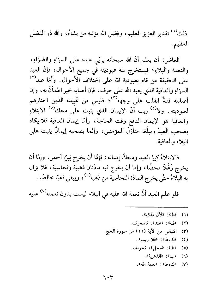 العاشر: أن يعلم أنّ اللَّه سبحانه يربّي عبده على السرّاءِ والضرّاءِ، والنعمة والبلاءِ؛ فيستخرج منه عبوديته في جميع الأحوال، فإنّ العبد على الحقيقة من قام بعبودية اللَّه على اختلاف الأحوال. وأمّا عبد (¬٢) السرّاءِ والعافية الذي يعبد اللَّه على حرف، فإن أصابه خير اطمأنّ به، وإن أصابته فتنةٌ انقلب على وجهه (¬٣)؛ فليس من عَبيده الذين اختارهم لعبوديته. ولا (¬٤) ريب أنّ الإيمان الذي يثبت على محكّ (¬٥) الابتلاءِ والعافية هو الإيمان النافع وقت الحاجة، وأمّا إيمان العافية فلا يكاد يصحب العبدَ ويبلّغه منازلَ المؤمنين، وإنّما يصحبه إيمانٌ يثبت على البلاء والعافية.
