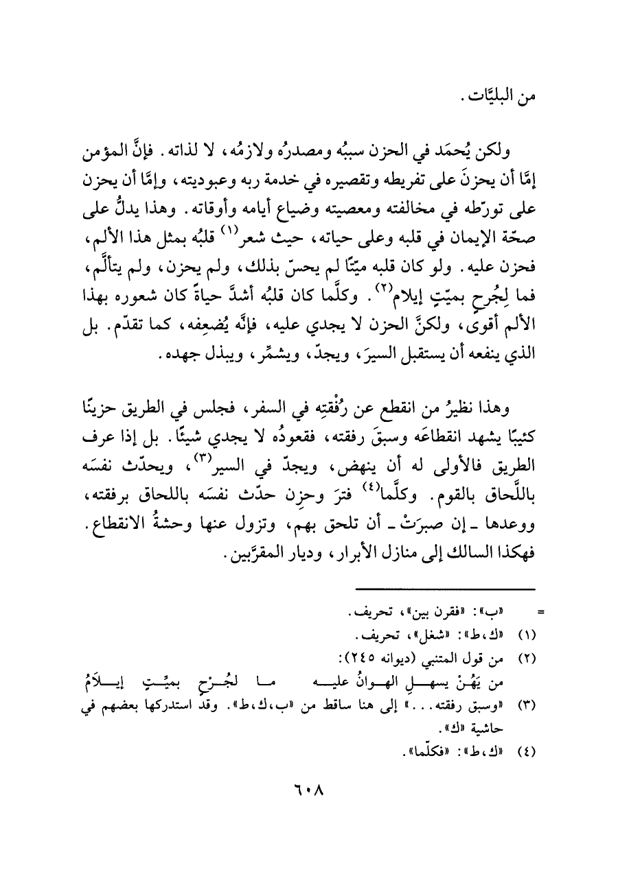 وهذا نظيرُ من انقطع عن رُفْقتِه في السفر، فجلس في الطريق حزينًا كئيبًا يشهد انقطاعَه وسبقَ رفقته، فقعودُه لا يجدي شيئًا. بل إذا عرف الطريق فالأولى له أن ينهض، ويجدّ في السير (¬٣)، ويحدّث نفسَه باللَّحاق بالقوم. وكلَّما (¬٤) فترَ وحزِن حدّث نفسَه باللحاق برفقته، ووعدها -إن صبرَتْ- أن تلحق بهم، وتزول عنها وحشةُ الانقطاع. فهكذا السالك إلى منازل الأبرار، وديار المقرَّبين.