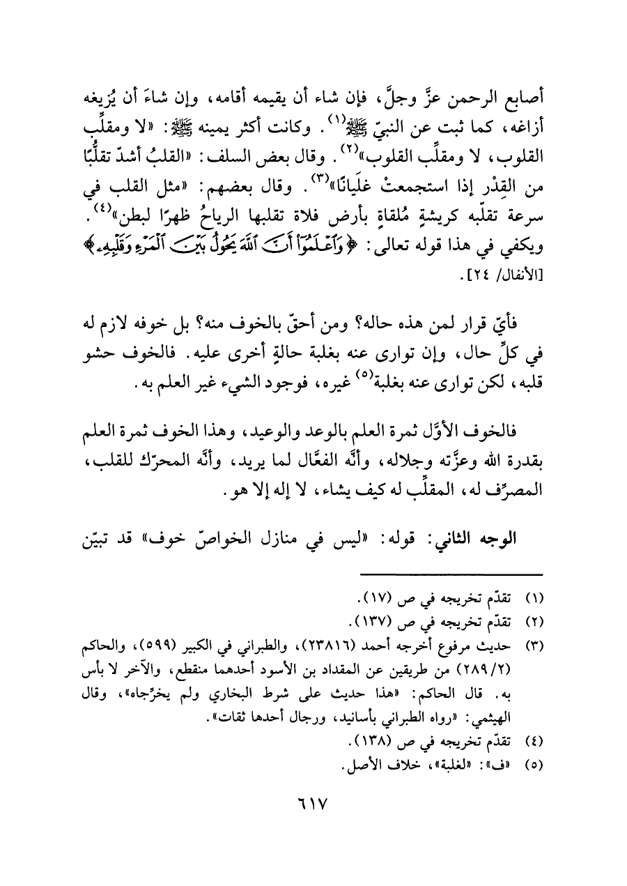 أصابع الرحمن عزَّ وجلَّ، فإن شاء أن يقيمه أقامه، وإن شاءَ أن يُزيغه أزاغه، كما ثبت عن النبيّ -صلى اللَّه عليه وسلم- (¬١). وكانت أكثر يمينه -صلى اللَّه عليه وسلم-: "لا ومقلِّب القلوب، لا ومقلِّب القلوب" (¬٢). وقال بعض السلف: "القلبُ أشدّ تقلُّبًا من القِدْر إذا استجمعتْ غلَيانًا" (¬٣). وقال بعضهم: "مثل القلب في سرعة تقلّبه كريشةٍ مُلقاةٍ بأرض فلاة تقلبها الرياحُ ظهرًا لبطن" (¬٤). ويكفي في هذا قوله تعالى: {وَاعْلَمُوا أَنَّ اللَّهَ يَحُولُ بَيْنَ الْمَرْءِ وَقَلْبِهِ} [الأنفال/ ٢٤].