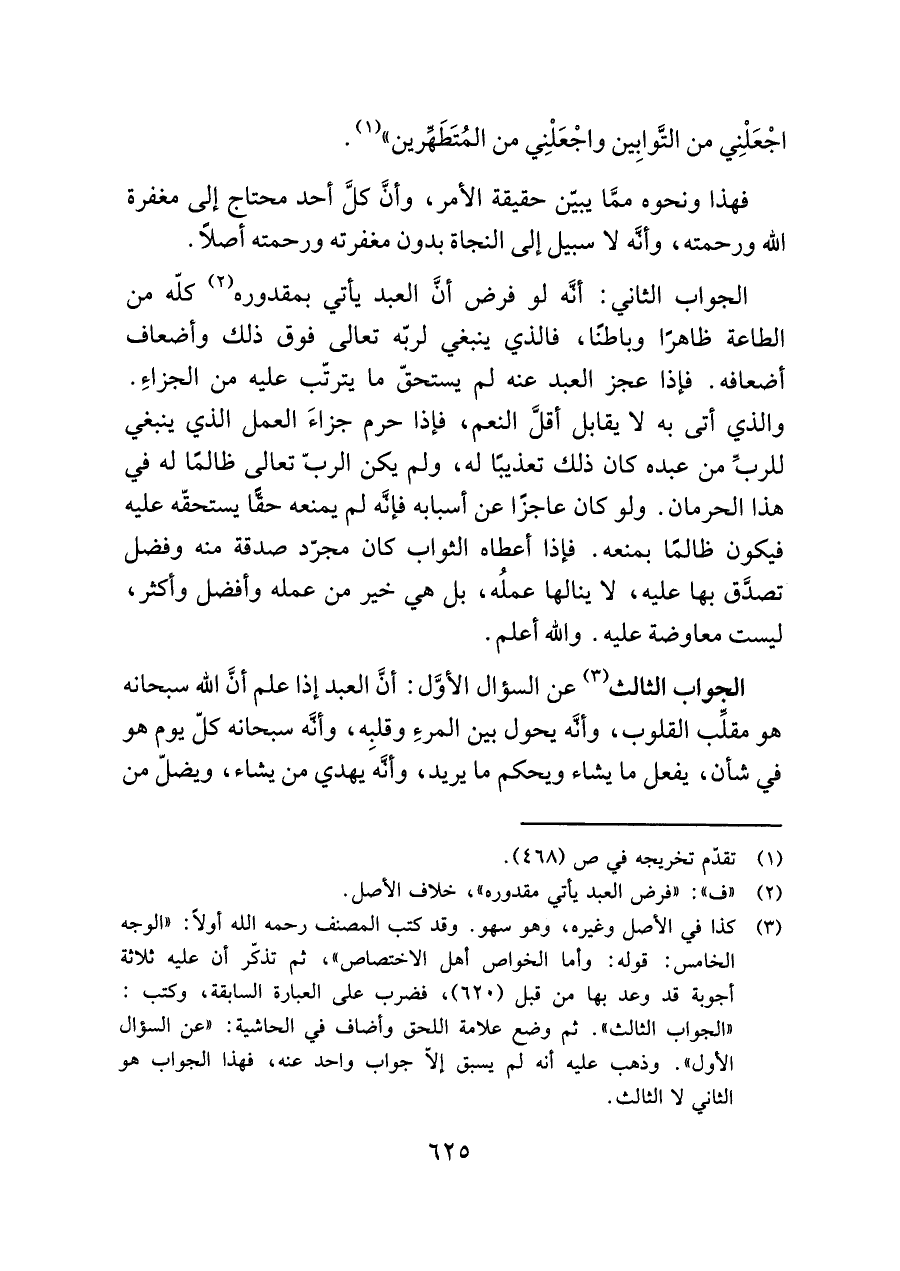 (¬٣) كذا في الأصل وغيره، وهو سهو. وقد كتب المصنف رحمه اللَّه أولًا: "الوجه الخامس: قوله: وأما الخواص أهل الاختصاص"، ثم تذكر أن عليه ثلاثة أجوبة قد وعد بها من قبل (٦٢٠)، فضرب على العبارة السابقة، وكتب: "الجواب الثالث". ثم وضع علامة اللحق وأضاف في الحاشية: "عن السؤال الأول". وذهب عليه أنه لم يسبق إلّا جواب واحد عنه، فهذا الجواب هو الثاني لا الثالث.