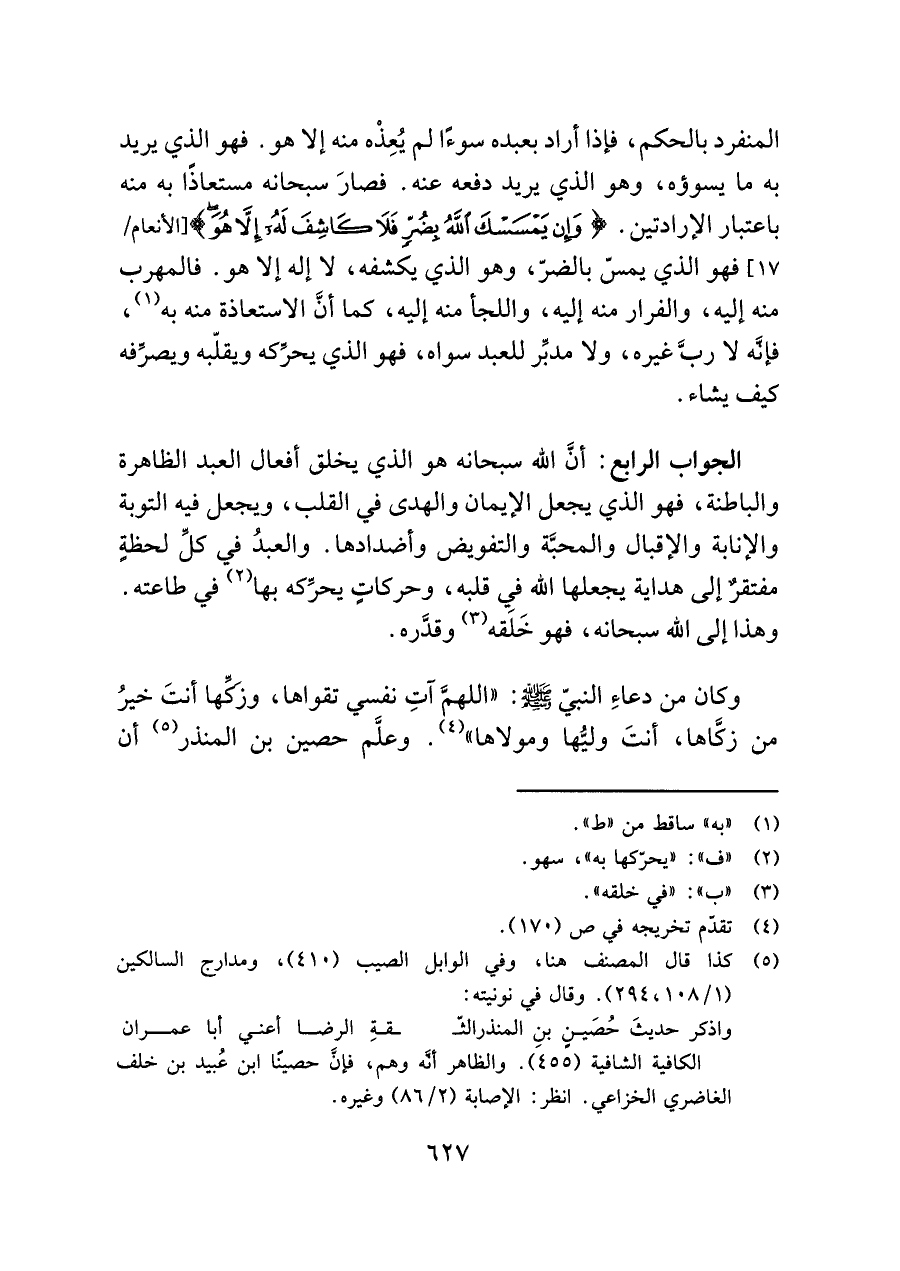 الجواب الرابع: أنَّ اللَّه سبحانه هو الذي يخلق أفعال العبد الظاهرة والباطنة، فهو الذي يجعل الإيمان والهدى في القلب، ويجعل فيه التوبة والإنابة والإقبال والمحبَّة والتفويض وأضدادها. والعبدُ في كلِّ لحظةٍ مفتقرٌ إلى هداية يجعلها اللَّه في قلبه، وحركاتٍ يحرِّكه بها (¬٢) في طاعته. وهذا إلى اللَّه سبحانه، فهو خَلَقه (¬٣) وقدَّره.