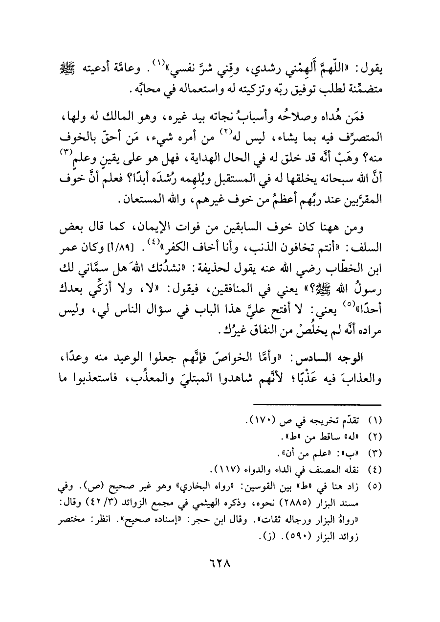 يقول: "اللّهمَّ أَلهِمْني رشدي، وقِني شرَّ نفسي" (¬١). وعامَّة أدعيته -صلى اللَّه عليه وسلم- متضمِّنة لطلب توفيق ربّه وتزكيته له واستعماله في محابِّه.