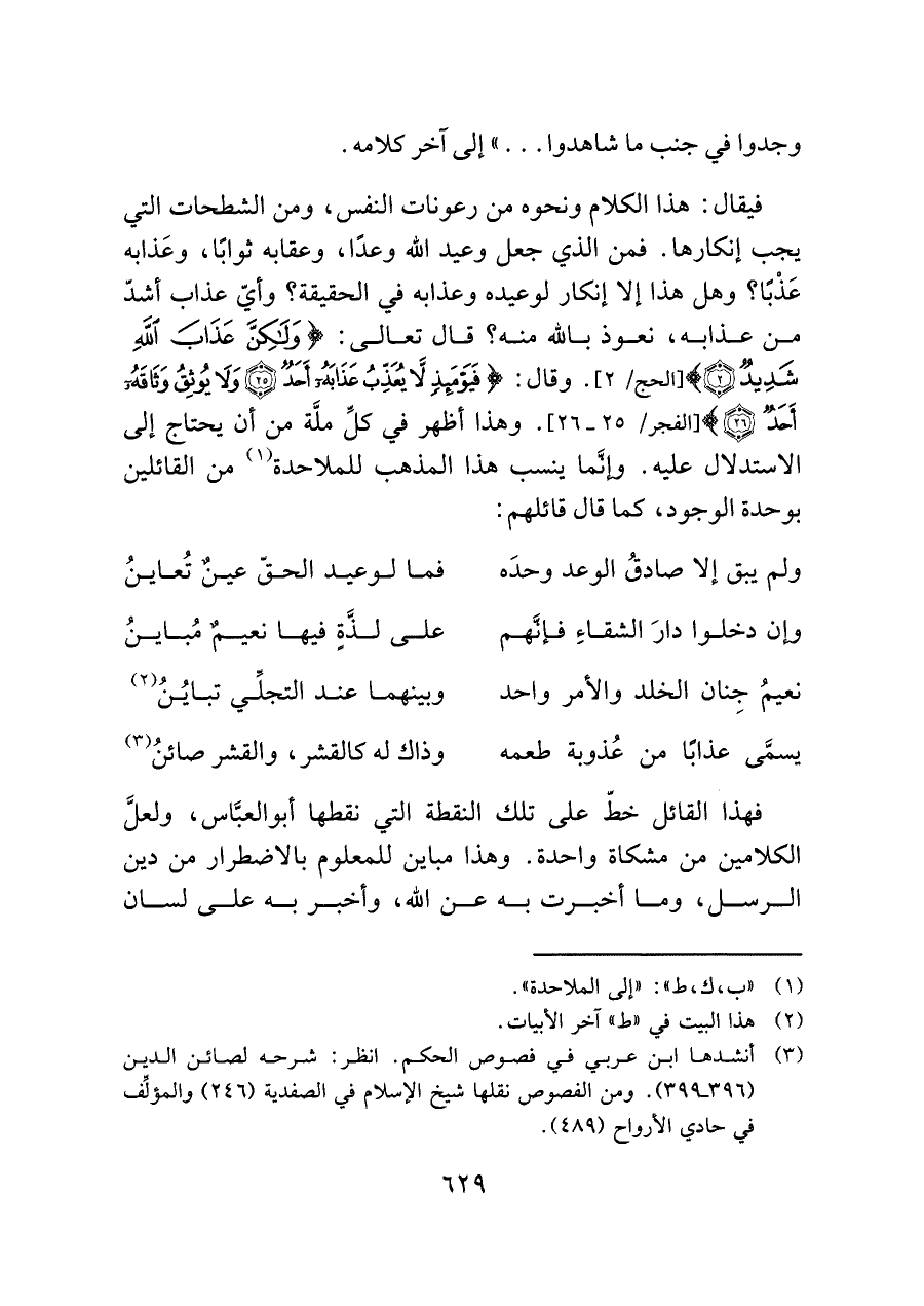 فيقال: هذا الكلام ونحوه من رعونات النفس، ومن الشطحات التي يجب إنكارها. فمن الذي جعل وعبد اللَّه وعدًا، وعقابه ثوابًا، وعَذابه عَذْبًا؟ وهل هذا إلا إنكار لوعيده وعذابه في الحقيقة؟ وأيّ عذاب أشدّ من عذابه، نعوذ باللَّه منه؟ قال تعالى: {وَلَكِنَّ عَذَابَ اللَّهِ شَدِيدٌ (٢)} [الحج/ ٢]. وقال: {فَيَوْمَئِذٍ لَا يُعَذِّبُ عَذَابَهُ أَحَدٌ (٢٥) وَلَا يُوثِقُ وَثَاقَهُ أَحَدٌ (٢٦)} [الفجر/ ٢٥ - ٢٦]. وهذا أظهر في كلِّ ملَّة من أن يحتاج إلى الاستدلال عليه. وإنَّما ينسب هذا المذهب للملاحدة (¬١) من القائلين بوحدة الوجود، كما قال قائلهم: