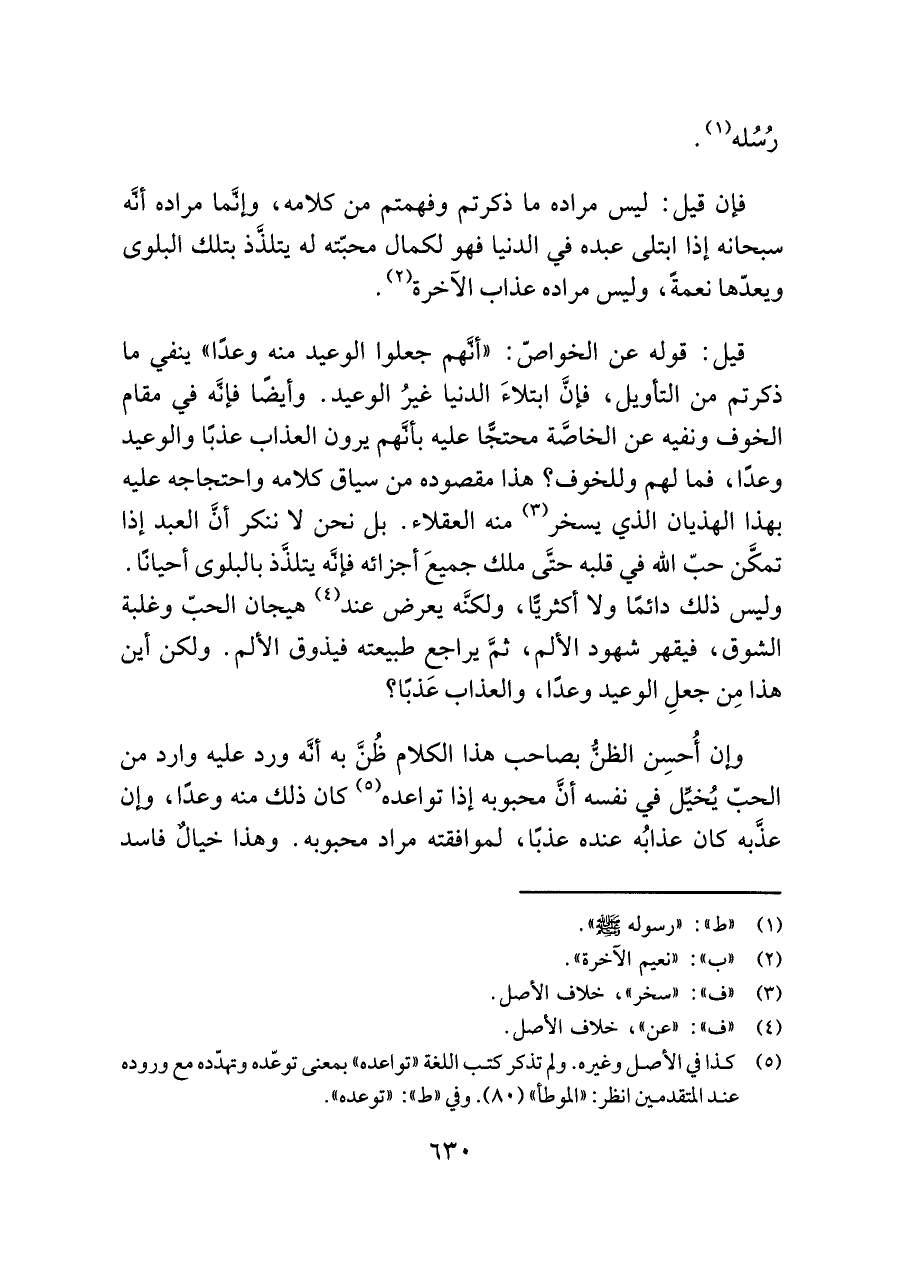 قيل: قوله عن الخواصّ: "أنَّهم جعلوا الوعيد منه وعدًا" ينفي ما ذكرتم من التأويل، فإنَّ ابتلاءَ الدنيا غيرُ الوعيد. وأيضا فإنَّه في مقام الخوف ونفيه عن الخاصَّة محتجًّا عليه بأنَّهم يرون العذاب عذبًا والوعيد وعدًا، فما لهم وللخوف؟ هذا مقصوده من سياق كلامه واحتجاجه عليه بهذا الهذيان الذي يسخر (¬٣) منه العقلاء. بل نحن لا ننكر أنَّ العبد إذا تمكَّن حبّ اللَّه في قلبه حتَّى ملك جميعَ أجزائه فإنَّه يتلذَّذ بالبلوى أحيانًا. وليس ذلك دائمًا ولا أكثريًّا، ولكنَّه يعرض عند (¬٤) هيجان الحبّ وغلبة الشوق، فيقهر شهود الألم، ثمَّ يراجع طبيعته فيذوق الألم. ولكن أين هذا مِن جعلِ الوعيد وعدًا، والعذاب عَذبًا؟
