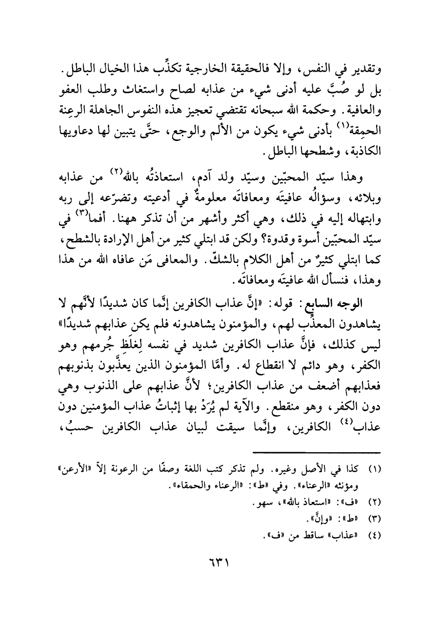 الوجه السابع: قوله: "إنَّ عذاب الكافرين إنَّما كان شديدًا لأنَّهم لا يشاهدون المعذِّب لهم، والمؤمنون يشاهدونه فلم يكن عذابهم شديدًا" ليس كذلك، فإنَّ عذاب الكافرين شديد في نفسه لِغلَظِ جُرمهم وهو الكفر، وهو دائم لا انقطاع له. وأمَّا المؤمنون الذين يعذَّبون بذنوبهم فعذابهم أضعف من عذاب الكافرين؛ لأنَّ عذابهم على الذنوب وهي دون الكفر، وهو منقطع. والآية لم يُرَدْ بها إثباتُ عذاب المؤمنين دون عذاب (¬٤) الكافرين، وإنَّما سيقت لبيان عذاب الكافرين حسبُ،